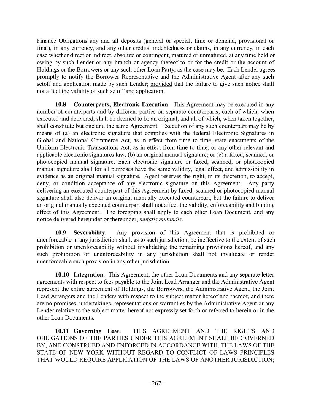 Finance Obligations any and all deposits (general or special, time or demand, provisional or final), in any currency, and any other credits, indebtedness or claims, in any currency, in each case whether direct or indirect, absolute or contingent, matured or unmatured, at any time held or owing by such Lender or any branch or agency thereof to or for the credit or the account of Holdings or the Borrowers or any such other Loan Party, as the case may be. Each Lender agrees promptly to notify the Borrower Representative and the Administrative Agent after any such setoff and application made by such Lender; provided that the failure to give such notice shall not affect the validity of such setoff and application. 10.8 Counterparts; Electronic Execution. This Agreement may be executed in any number of counterparts and by different parties on separate counterparts, each of which, when executed and delivered, shall be deemed to be an original, and all of which, when taken together, shall constitute but one and the same Agreement. Execution of any such counterpart may be by means of (a) an electronic signature that complies with the federal Electronic Signatures in Global and National Commerce Act, as in effect from time to time, state enactments of the Uniform Electronic Transactions Act, as in effect from time to time, or any other relevant and applicable electronic signatures law; (b) an original manual signature; or (c) a faxed, scanned, or photocopied manual signature. Each electronic signature or faxed, scanned, or photocopied manual signature shall for all purposes have the same validity, legal effect, and admissibility in evidence as an original manual signature. Agent reserves the right, in its discretion, to accept, deny, or condition acceptance of any electronic signature on this Agreement. Any party delivering an executed counterpart of this Agreement by faxed, scanned or photocopied manual signature shall also deliver an original manually executed counterpart, but the failure to deliver an original manually executed counterpart shall not affect the validity, enforceability and binding effect of this Agreement. The foregoing shall apply to each other Loan Document, and any notice delivered hereunder or thereunder, mutatis mutandis. 10.9 Severability. Any provision of this Agreement that is prohibited or unenforceable in any jurisdiction shall, as to such jurisdiction, be ineffective to the extent of such prohibition or unenforceability without invalidating the remaining provisions hereof, and any such prohibition or unenforceability in any jurisdiction shall not invalidate or render unenforceable such provision in any other jurisdiction. 10.10 Integration. This Agreement, the other Loan Documents and any separate letter agreements with respect to fees payable to the Joint Lead Arranger and the Administrative Agent represent the entire agreement of Holdings, the Borrowers, the Administrative Agent, the Joint Lead Arrangers and the Lenders with respect to the subject matter hereof and thereof, and there are no promises, undertakings, representations or warranties by the Administrative Agent or any Lender relative to the subject matter hereof not expressly set forth or referred to herein or in the other Loan Documents. 10.11 Governing Law. THIS AGREEMENT AND THE RIGHTS AND OBLIGATIONS OF THE PARTIES UNDER THIS AGREEMENT SHALL BE GOVERNED BY, AND CONSTRUED AND ENFORCED IN ACCORDANCE WITH, THE LAWS OF THE STATE OF NEW YORK WITHOUT REGARD TO CONFLICT OF LAWS PRINCIPLES THAT WOULD REQUIRE APPLICATION OF THE LAWS OF ANOTHER JURISDICTION; - 267 -