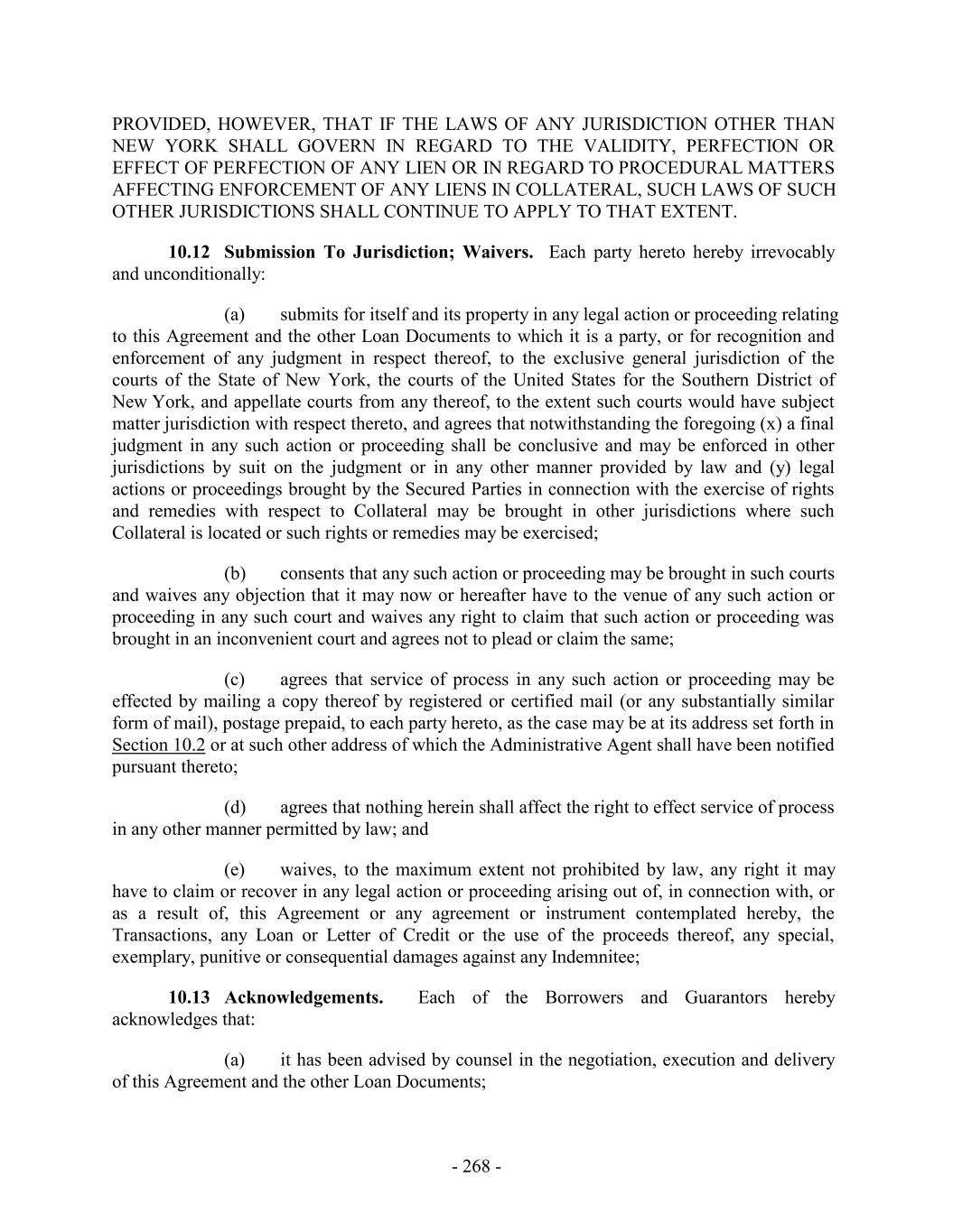 PROVIDED, HOWEVER, THAT IF THE LAWS OF ANY JURISDICTION OTHER THAN NEW YORK SHALL GOVERN IN REGARD TO THE VALIDITY, PERFECTION OR EFFECT OF PERFECTION OF ANY LIEN OR IN REGARD TO PROCEDURAL MATTERS AFFECTING ENFORCEMENT OF ANY LIENS IN COLLATERAL, SUCH LAWS OF SUCH OTHER JURISDICTIONS SHALL CONTINUE TO APPLY TO THAT EXTENT. 10.12 Submission To Jurisdiction; Waivers. Each party hereto hereby irrevocably and unconditionally: (a) submits for itself and its property in any legal action or proceeding relating to this Agreement and the other Loan Documents to which it is a party, or for recognition and enforcement of any judgment in respect thereof, to the exclusive general jurisdiction of the courts of the State of New York, the courts of the United States for the Southern District of New York, and appellate courts from any thereof, to the extent such courts would have subject matter jurisdiction with respect thereto, and agrees that notwithstanding the foregoing (x) a final judgment in any such action or proceeding shall be conclusive and may be enforced in other jurisdictions by suit on the judgment or in any other manner provided by law and (y) legal actions or proceedings brought by the Secured Parties in connection with the exercise of rights and remedies with respect to Collateral may be brought in other jurisdictions where such Collateral is located or such rights or remedies may be exercised; (b) consents that any such action or proceeding may be brought in such courts and waives any objection that it may now or hereafter have to the venue of any such action or proceeding in any such court and waives any right to claim that such action or proceeding was brought in an inconvenient court and agrees not to plead or claim the same; (c) agrees that service of process in any such action or proceeding may be effected by mailing a copy thereof by registered or certified mail (or any substantially similar form of mail), postage prepaid, to each party hereto, as the case may be at its address set forth in Section 10.2 or at such other address of which the Administrative Agent shall have been notified pursuant thereto; (d) agrees that nothing herein shall affect the right to effect service of process in any other manner permitted by law; and (e) waives, to the maximum extent not prohibited by law, any right it may have to claim or recover in any legal action or proceeding arising out of, in connection with, or as a result of, this Agreement or any agreement or instrument contemplated hereby, the Transactions, any Loan or Letter of Credit or the use of the proceeds thereof, any special, exemplary, punitive or consequential damages against any Indemnitee; 10.13 Acknowledgements. Each of the Borrowers and Guarantors hereby acknowledges that: (a) it has been advised by counsel in the negotiation, execution and delivery of this Agreement and the other Loan Documents; - 268 -
