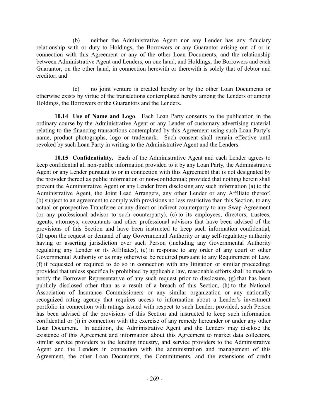 (b) neither the Administrative Agent nor any Lender has any fiduciary relationship with or duty to Holdings, the Borrowers or any Guarantor arising out of or in connection with this Agreement or any of the other Loan Documents, and the relationship between Administrative Agent and Lenders, on one hand, and Holdings, the Borrowers and each Guarantor, on the other hand, in connection herewith or therewith is solely that of debtor and creditor; and (c) no joint venture is created hereby or by the other Loan Documents or otherwise exists by virtue of the transactions contemplated hereby among the Lenders or among Holdings, the Borrowers or the Guarantors and the Lenders. 10.14 Use of Name and Logo. Each Loan Party consents to the publication in the ordinary course by the Administrative Agent or any Lender of customary advertising material relating to the financing transactions contemplated by this Agreement using such Loan Party’s name, product photographs, logo or trademark. Such consent shall remain effective until revoked by such Loan Party in writing to the Administrative Agent and the Lenders. 10.15 Confidentiality. Each of the Administrative Agent and each Lender agrees to keep confidential all non-public information provided to it by any Loan Party, the Administrative Agent or any Lender pursuant to or in connection with this Agreement that is not designated by the provider thereof as public information or non-confidential; provided that nothing herein shall prevent the Administrative Agent or any Lender from disclosing any such information (a) to the Administrative Agent, the Joint Lead Arrangers, any other Lender or any Affiliate thereof, (b) subject to an agreement to comply with provisions no less restrictive than this Section, to any actual or prospective Transferee or any direct or indirect counterparty to any Swap Agreement (or any professional advisor to such counterparty), (c) to its employees, directors, trustees, agents, attorneys, accountants and other professional advisors that have been advised of the provisions of this Section and have been instructed to keep such information confidential, (d) upon the request or demand of any Governmental Authority or any self-regulatory authority having or asserting jurisdiction over such Person (including any Governmental Authority regulating any Lender or its Affiliates), (e) in response to any order of any court or other Governmental Authority or as may otherwise be required pursuant to any Requirement of Law, (f) if requested or required to do so in connection with any litigation or similar proceeding; provided that unless specifically prohibited by applicable law, reasonable efforts shall be made to notify the Borrower Representative of any such request prior to disclosure, (g) that has been publicly disclosed other than as a result of a breach of this Section, (h) to the National Association of Insurance Commissioners or any similar organization or any nationally recognized rating agency that requires access to information about a Lender’s investment portfolio in connection with ratings issued with respect to such Lender; provided, such Person has been advised of the provisions of this Section and instructed to keep such information confidential or (i) in connection with the exercise of any remedy hereunder or under any other Loan Document. In addition, the Administrative Agent and the Lenders may disclose the existence of this Agreement and information about this Agreement to market data collectors, similar service providers to the lending industry, and service providers to the Administrative Agent and the Lenders in connection with the administration and management of this Agreement, the other Loan Documents, the Commitments, and the extensions of credit - 269 -