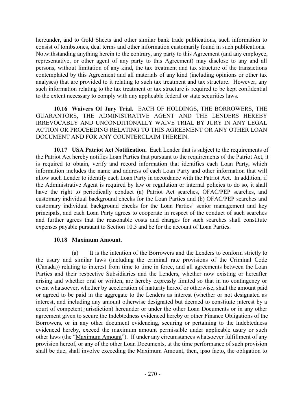 hereunder, and to Gold Sheets and other similar bank trade publications, such information to consist of tombstones, deal terms and other information customarily found in such publications. Notwithstanding anything herein to the contrary, any party to this Agreement (and any employee, representative, or other agent of any party to this Agreement) may disclose to any and all persons, without limitation of any kind, the tax treatment and tax structure of the transactions contemplated by this Agreement and all materials of any kind (including opinions or other tax analyses) that are provided to it relating to such tax treatment and tax structure. However, any such information relating to the tax treatment or tax structure is required to be kept confidential to the extent necessary to comply with any applicable federal or state securities laws. 10.16 Waivers Of Jury Trial. EACH OF HOLDINGS, THE BORROWERS, THE GUARANTORS, THE ADMINISTRATIVE AGENT AND THE LENDERS HEREBY IRREVOCABLY AND UNCONDITIONALLY WAIVE TRIAL BY JURY IN ANY LEGAL ACTION OR PROCEEDING RELATING TO THIS AGREEMENT OR ANY OTHER LOAN DOCUMENT AND FOR ANY COUNTERCLAIM THEREIN. 10.17 USA Patriot Act Notification. Each Lender that is subject to the requirements of the Patriot Act hereby notifies Loan Parties that pursuant to the requirements of the Patriot Act, it is required to obtain, verify and record information that identifies each Loan Party, which information includes the name and address of each Loan Party and other information that will allow such Lender to identify each Loan Party in accordance with the Patriot Act. In addition, if the Administrative Agent is required by law or regulation or internal policies to do so, it shall have the right to periodically conduct (a) Patriot Act searches, OFAC/PEP searches, and customary individual background checks for the Loan Parties and (b) OFAC/PEP searches and customary individual background checks for the Loan Parties’ senior management and key principals, and each Loan Party agrees to cooperate in respect of the conduct of such searches and further agrees that the reasonable costs and charges for such searches shall constitute expenses payable pursuant to Section 10.5 and be for the account of Loan Parties. 10.18 Maximum Amount. (a) It is the intention of the Borrowers and the Lenders to conform strictly to the usury and similar laws (including the criminal rate provisions of the Criminal Code (Canada)) relating to interest from time to time in force, and all agreements between the Loan Parties and their respective Subsidiaries and the Lenders, whether now existing or hereafter arising and whether oral or written, are hereby expressly limited so that in no contingency or event whatsoever, whether by acceleration of maturity hereof or otherwise, shall the amount paid or agreed to be paid in the aggregate to the Lenders as interest (whether or not designated as interest, and including any amount otherwise designated but deemed to constitute interest by a court of competent jurisdiction) hereunder or under the other Loan Documents or in any other agreement given to secure the Indebtedness evidenced hereby or other Finance Obligations of the Borrowers, or in any other document evidencing, securing or pertaining to the Indebtedness evidenced hereby, exceed the maximum amount permissible under applicable usury or such other laws (the “Maximum Amount”). If under any circumstances whatsoever fulfillment of any provision hereof, or any of the other Loan Documents, at the time performance of such provision shall be due, shall involve exceeding the Maximum Amount, then, ipso facto, the obligation to - 270 -