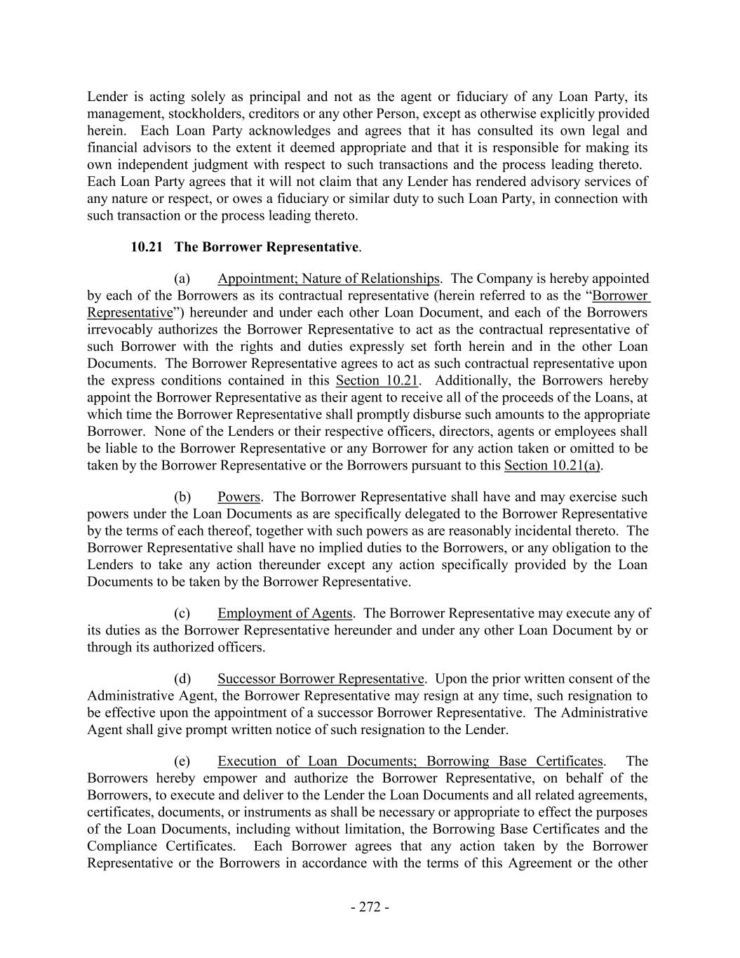 Lender is acting solely as principal and not as the agent or fiduciary of any Loan Party, its management, stockholders, creditors or any other Person, except as otherwise explicitly provided herein. Each Loan Party acknowledges and agrees that it has consulted its own legal and financial advisors to the extent it deemed appropriate and that it is responsible for making its own independent judgment with respect to such transactions and the process leading thereto. Each Loan Party agrees that it will not claim that any Lender has rendered advisory services of any nature or respect, or owes a fiduciary or similar duty to such Loan Party, in connection with such transaction or the process leading thereto. 10.21 The Borrower Representative. (a) Appointment; Nature of Relationships. The Company is hereby appointed by each of the Borrowers as its contractual representative (herein referred to as the “Borrower Representative”) hereunder and under each other Loan Document, and each of the Borrowers irrevocably authorizes the Borrower Representative to act as the contractual representative of such Borrower with the rights and duties expressly set forth herein and in the other Loan Documents. The Borrower Representative agrees to act as such contractual representative upon the express conditions contained in this Section 10.21. Additionally, the Borrowers hereby appoint the Borrower Representative as their agent to receive all of the proceeds of the Loans, at which time the Borrower Representative shall promptly disburse such amounts to the appropriate Borrower. None of the Lenders or their respective officers, directors, agents or employees shall be liable to the Borrower Representative or any Borrower for any action taken or omitted to be taken by the Borrower Representative or the Borrowers pursuant to this Section 10.21(a). (b) Powers. The Borrower Representative shall have and may exercise such powers under the Loan Documents as are specifically delegated to the Borrower Representative by the terms of each thereof, together with such powers as are reasonably incidental thereto. The Borrower Representative shall have no implied duties to the Borrowers, or any obligation to the Lenders to take any action thereunder except any action specifically provided by the Loan Documents to be taken by the Borrower Representative. (c) Employment of Agents. The Borrower Representative may execute any of its duties as the Borrower Representative hereunder and under any other Loan Document by or through its authorized officers. (d) Successor Borrower Representative. Upon the prior written consent of the Administrative Agent, the Borrower Representative may resign at any time, such resignation to be effective upon the appointment of a successor Borrower Representative. The Administrative Agent shall give prompt written notice of such resignation to the Lender. (e) Execution of Loan Documents; Borrowing Base Certificates. The Borrowers hereby empower and authorize the Borrower Representative, on behalf of the Borrowers, to execute and deliver to the Lender the Loan Documents and all related agreements, certificates, documents, or instruments as shall be necessary or appropriate to effect the purposes of the Loan Documents, including without limitation, the Borrowing Base Certificates and the Compliance Certificates. Each Borrower agrees that any action taken by the Borrower Representative or the Borrowers in accordance with the terms of this Agreement or the other - 272 -