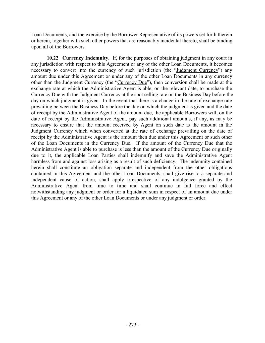Loan Documents, and the exercise by the Borrower Representative of its powers set forth therein or herein, together with such other powers that are reasonably incidental thereto, shall be binding upon all of the Borrowers. 10.22 Currency Indemnity. If, for the purposes of obtaining judgment in any court in any jurisdiction with respect to this Agreement or any of the other Loan Documents, it becomes necessary to convert into the currency of such jurisdiction (the “Judgment Currency”) any amount due under this Agreement or under any of the other Loan Documents in any currency other than the Judgment Currency (the “Currency Due”), then conversion shall be made at the exchange rate at which the Administrative Agent is able, on the relevant date, to purchase the Currency Due with the Judgment Currency at the spot selling rate on the Business Day before the day on which judgment is given. In the event that there is a change in the rate of exchange rate prevailing between the Business Day before the day on which the judgment is given and the date of receipt by the Administrative Agent of the amount due, the applicable Borrowers will, on the date of receipt by the Administrative Agent, pay such additional amounts, if any, as may be necessary to ensure that the amount received by Agent on such date is the amount in the Judgment Currency which when converted at the rate of exchange prevailing on the date of receipt by the Administrative Agent is the amount then due under this Agreement or such other of the Loan Documents in the Currency Due. If the amount of the Currency Due that the Administrative Agent is able to purchase is less than the amount of the Currency Due originally due to it, the applicable Loan Parties shall indemnify and save the Administrative Agent harmless from and against loss arising as a result of such deficiency. The indemnity contained herein shall constitute an obligation separate and independent from the other obligations contained in this Agreement and the other Loan Documents, shall give rise to a separate and independent cause of action, shall apply irrespective of any indulgence granted by the Administrative Agent from time to time and shall continue in full force and effect notwithstanding any judgment or order for a liquidated sum in respect of an amount due under this Agreement or any of the other Loan Documents or under any judgment or order. - 273 -