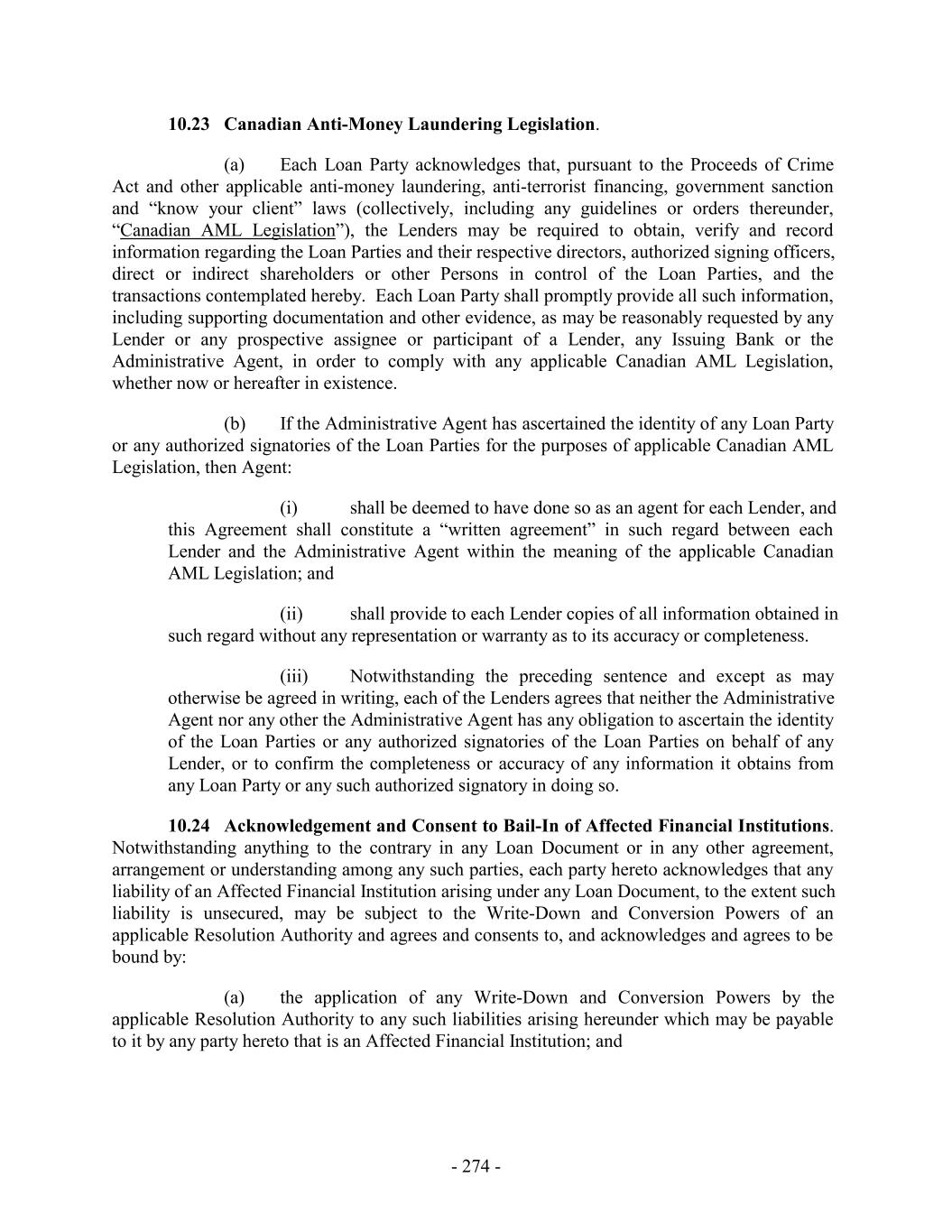 10.23 Canadian Anti-Money Laundering Legislation. (a) Each Loan Party acknowledges that, pursuant to the Proceeds of Crime Act and other applicable anti-money laundering, anti-terrorist financing, government sanction and “know your client” laws (collectively, including any guidelines or orders thereunder, “Canadian AML Legislation”), the Lenders may be required to obtain, verify and record information regarding the Loan Parties and their respective directors, authorized signing officers, direct or indirect shareholders or other Persons in control of the Loan Parties, and the transactions contemplated hereby. Each Loan Party shall promptly provide all such information, including supporting documentation and other evidence, as may be reasonably requested by any Lender or any prospective assignee or participant of a Lender, any Issuing Bank or the Administrative Agent, in order to comply with any applicable Canadian AML Legislation, whether now or hereafter in existence. (b) If the Administrative Agent has ascertained the identity of any Loan Party or any authorized signatories of the Loan Parties for the purposes of applicable Canadian AML Legislation, then Agent: (i) shall be deemed to have done so as an agent for each Lender, and this Agreement shall constitute a “written agreement” in such regard between each Lender and the Administrative Agent within the meaning of the applicable Canadian AML Legislation; and (ii) shall provide to each Lender copies of all information obtained in such regard without any representation or warranty as to its accuracy or completeness. (iii) Notwithstanding the preceding sentence and except as may otherwise be agreed in writing, each of the Lenders agrees that neither the Administrative Agent nor any other the Administrative Agent has any obligation to ascertain the identity of the Loan Parties or any authorized signatories of the Loan Parties on behalf of any Lender, or to confirm the completeness or accuracy of any information it obtains from any Loan Party or any such authorized signatory in doing so. 10.24 Acknowledgement and Consent to Bail-In of Affected Financial Institutions. Notwithstanding anything to the contrary in any Loan Document or in any other agreement, arrangement or understanding among any such parties, each party hereto acknowledges that any liability of an Affected Financial Institution arising under any Loan Document, to the extent such liability is unsecured, may be subject to the Write-Down and Conversion Powers of an applicable Resolution Authority and agrees and consents to, and acknowledges and agrees to be bound by: (a) the application of any Write-Down and Conversion Powers by the applicable Resolution Authority to any such liabilities arising hereunder which may be payable to it by any party hereto that is an Affected Financial Institution; and - 274 -