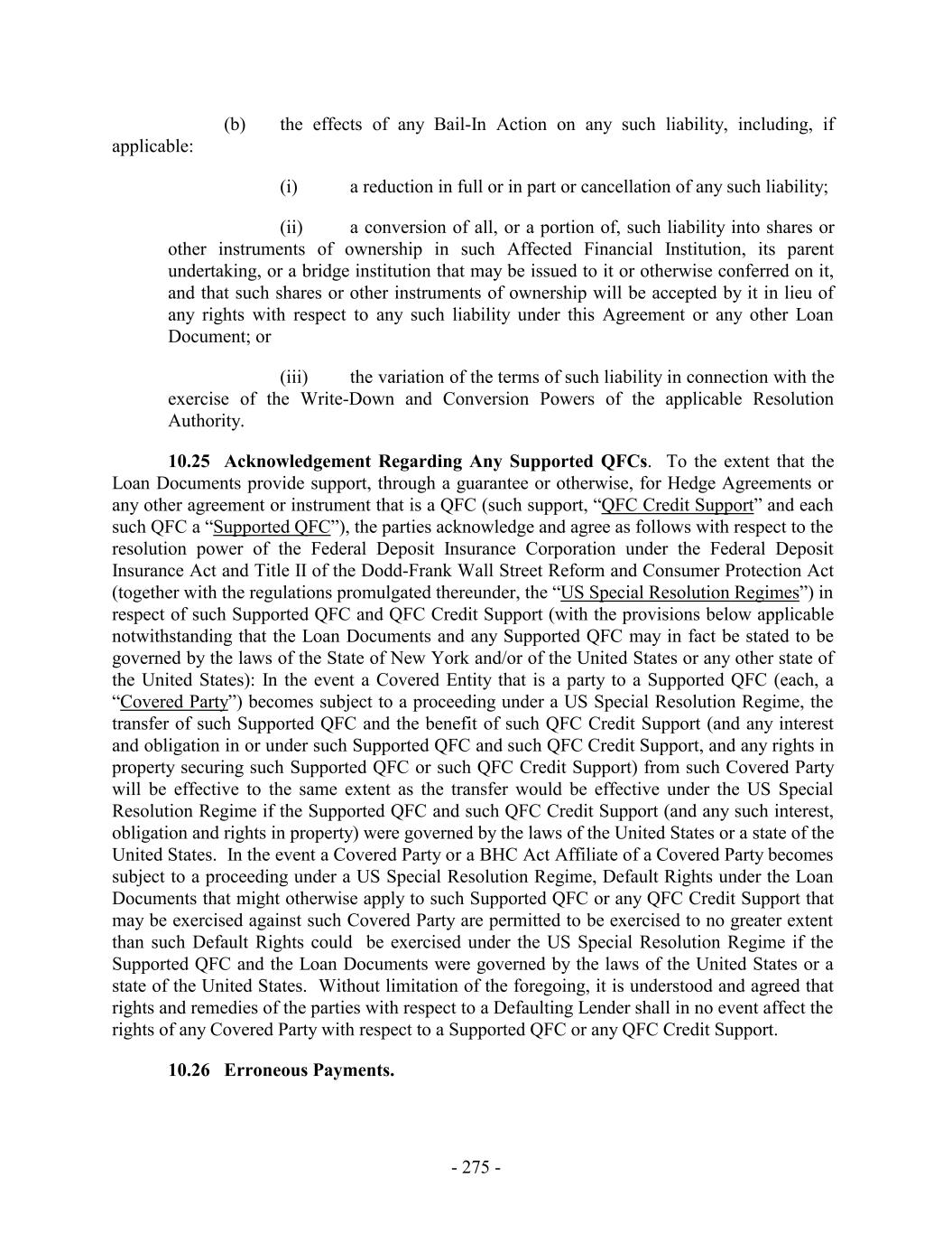(b) the effects of any Bail-In Action on any such liability, including, if applicable: (i) a reduction in full or in part or cancellation of any such liability; (ii) a conversion of all, or a portion of, such liability into shares or other instruments of ownership in such Affected Financial Institution, its parent undertaking, or a bridge institution that may be issued to it or otherwise conferred on it, and that such shares or other instruments of ownership will be accepted by it in lieu of any rights with respect to any such liability under this Agreement or any other Loan Document; or (iii) the variation of the terms of such liability in connection with the exercise of the Write-Down and Conversion Powers of the applicable Resolution Authority. 10.25 Acknowledgement Regarding Any Supported QFCs. To the extent that the Loan Documents provide support, through a guarantee or otherwise, for Hedge Agreements or any other agreement or instrument that is a QFC (such support, “QFC Credit Support” and each such QFC a “Supported QFC”), the parties acknowledge and agree as follows with respect to the resolution power of the Federal Deposit Insurance Corporation under the Federal Deposit Insurance Act and Title II of the Dodd-Frank Wall Street Reform and Consumer Protection Act (together with the regulations promulgated thereunder, the “US Special Resolution Regimes”) in respect of such Supported QFC and QFC Credit Support (with the provisions below applicable notwithstanding that the Loan Documents and any Supported QFC may in fact be stated to be governed by the laws of the State of New York and/or of the United States or any other state of the United States): In the event a Covered Entity that is a party to a Supported QFC (each, a “Covered Party”) becomes subject to a proceeding under a US Special Resolution Regime, the transfer of such Supported QFC and the benefit of such QFC Credit Support (and any interest and obligation in or under such Supported QFC and such QFC Credit Support, and any rights in property securing such Supported QFC or such QFC Credit Support) from such Covered Party will be effective to the same extent as the transfer would be effective under the US Special Resolution Regime if the Supported QFC and such QFC Credit Support (and any such interest, obligation and rights in property) were governed by the laws of the United States or a state of the United States. In the event a Covered Party or a BHC Act Affiliate of a Covered Party becomes subject to a proceeding under a US Special Resolution Regime, Default Rights under the Loan Documents that might otherwise apply to such Supported QFC or any QFC Credit Support that may be exercised against such Covered Party are permitted to be exercised to no greater extent than such Default Rights could be exercised under the US Special Resolution Regime if the Supported QFC and the Loan Documents were governed by the laws of the United States or a state of the United States. Without limitation of the foregoing, it is understood and agreed that rights and remedies of the parties with respect to a Defaulting Lender shall in no event affect the rights of any Covered Party with respect to a Supported QFC or any QFC Credit Support. 10.26 Erroneous Payments. - 275 -
