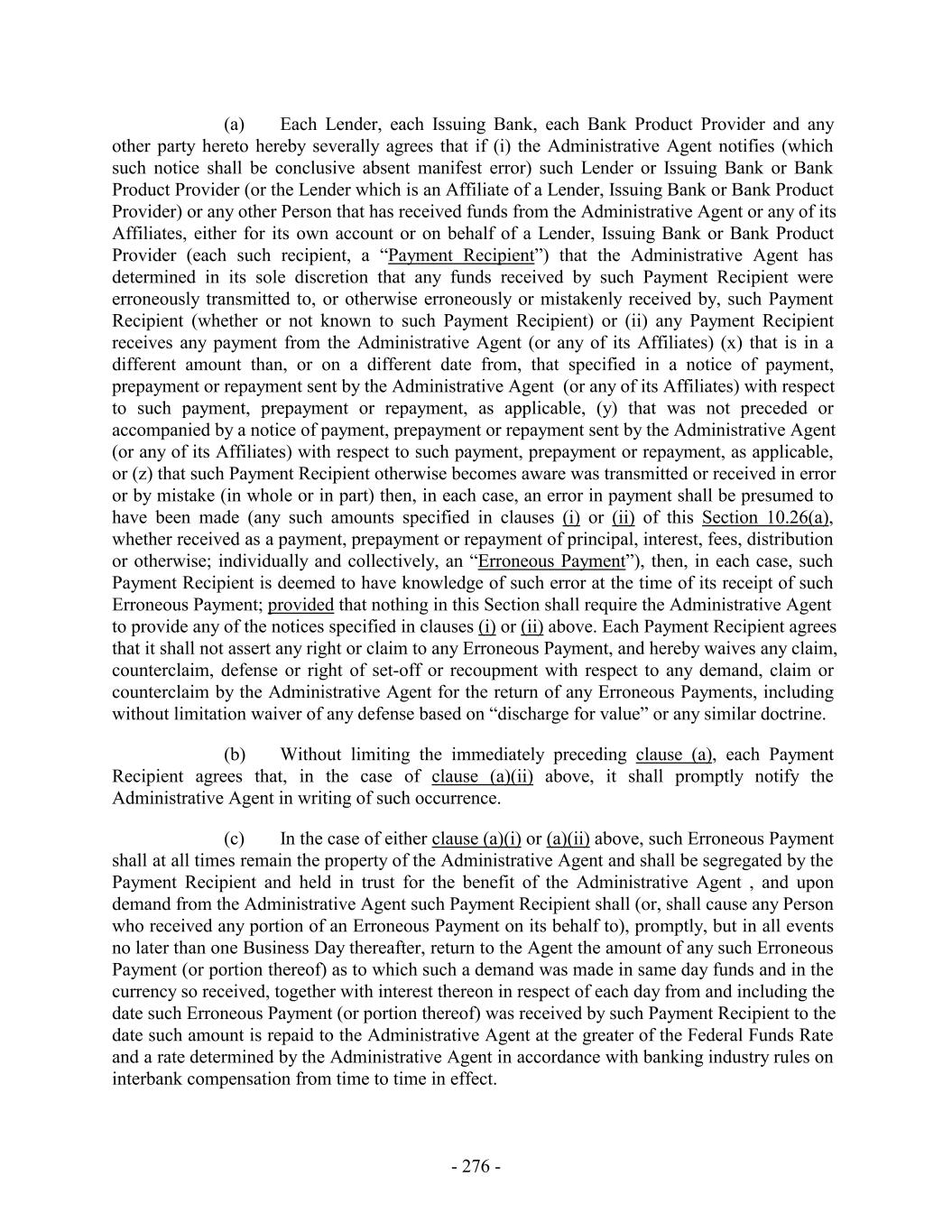(a) Each Lender, each Issuing Bank, each Bank Product Provider and any other party hereto hereby severally agrees that if (i) the Administrative Agent notifies (which such notice shall be conclusive absent manifest error) such Lender or Issuing Bank or Bank Product Provider (or the Lender which is an Affiliate of a Lender, Issuing Bank or Bank Product Provider) or any other Person that has received funds from the Administrative Agent or any of its Affiliates, either for its own account or on behalf of a Lender, Issuing Bank or Bank Product Provider (each such recipient, a “Payment Recipient”) that the Administrative Agent has determined in its sole discretion that any funds received by such Payment Recipient were erroneously transmitted to, or otherwise erroneously or mistakenly received by, such Payment Recipient (whether or not known to such Payment Recipient) or (ii) any Payment Recipient receives any payment from the Administrative Agent (or any of its Affiliates) (x) that is in a different amount than, or on a different date from, that specified in a notice of payment, prepayment or repayment sent by the Administrative Agent (or any of its Affiliates) with respect to such payment, prepayment or repayment, as applicable, (y) that was not preceded or accompanied by a notice of payment, prepayment or repayment sent by the Administrative Agent (or any of its Affiliates) with respect to such payment, prepayment or repayment, as applicable, or (z) that such Payment Recipient otherwise becomes aware was transmitted or received in error or by mistake (in whole or in part) then, in each case, an error in payment shall be presumed to have been made (any such amounts specified in clauses (i) or (ii) of this Section 10.26(a), whether received as a payment, prepayment or repayment of principal, interest, fees, distribution or otherwise; individually and collectively, an “Erroneous Payment”), then, in each case, such Payment Recipient is deemed to have knowledge of such error at the time of its receipt of such Erroneous Payment; provided that nothing in this Section shall require the Administrative Agent to provide any of the notices specified in clauses (i) or (ii) above. Each Payment Recipient agrees that it shall not assert any right or claim to any Erroneous Payment, and hereby waives any claim, counterclaim, defense or right of set-off or recoupment with respect to any demand, claim or counterclaim by the Administrative Agent for the return of any Erroneous Payments, including without limitation waiver of any defense based on “discharge for value” or any similar doctrine. (b) Without limiting the immediately preceding clause (a), each Payment Recipient agrees that, in the case of clause (a)(ii) above, it shall promptly notify the Administrative Agent in writing of such occurrence. (c) In the case of either clause (a)(i) or (a)(ii) above, such Erroneous Payment shall at all times remain the property of the Administrative Agent and shall be segregated by the Payment Recipient and held in trust for the benefit of the Administrative Agent , and upon demand from the Administrative Agent such Payment Recipient shall (or, shall cause any Person who received any portion of an Erroneous Payment on its behalf to), promptly, but in all events no later than one Business Day thereafter, return to the Agent the amount of any such Erroneous Payment (or portion thereof) as to which such a demand was made in same day funds and in the currency so received, together with interest thereon in respect of each day from and including the date such Erroneous Payment (or portion thereof) was received by such Payment Recipient to the date such amount is repaid to the Administrative Agent at the greater of the Federal Funds Rate and a rate determined by the Administrative Agent in accordance with banking industry rules on interbank compensation from time to time in effect. - 276 -