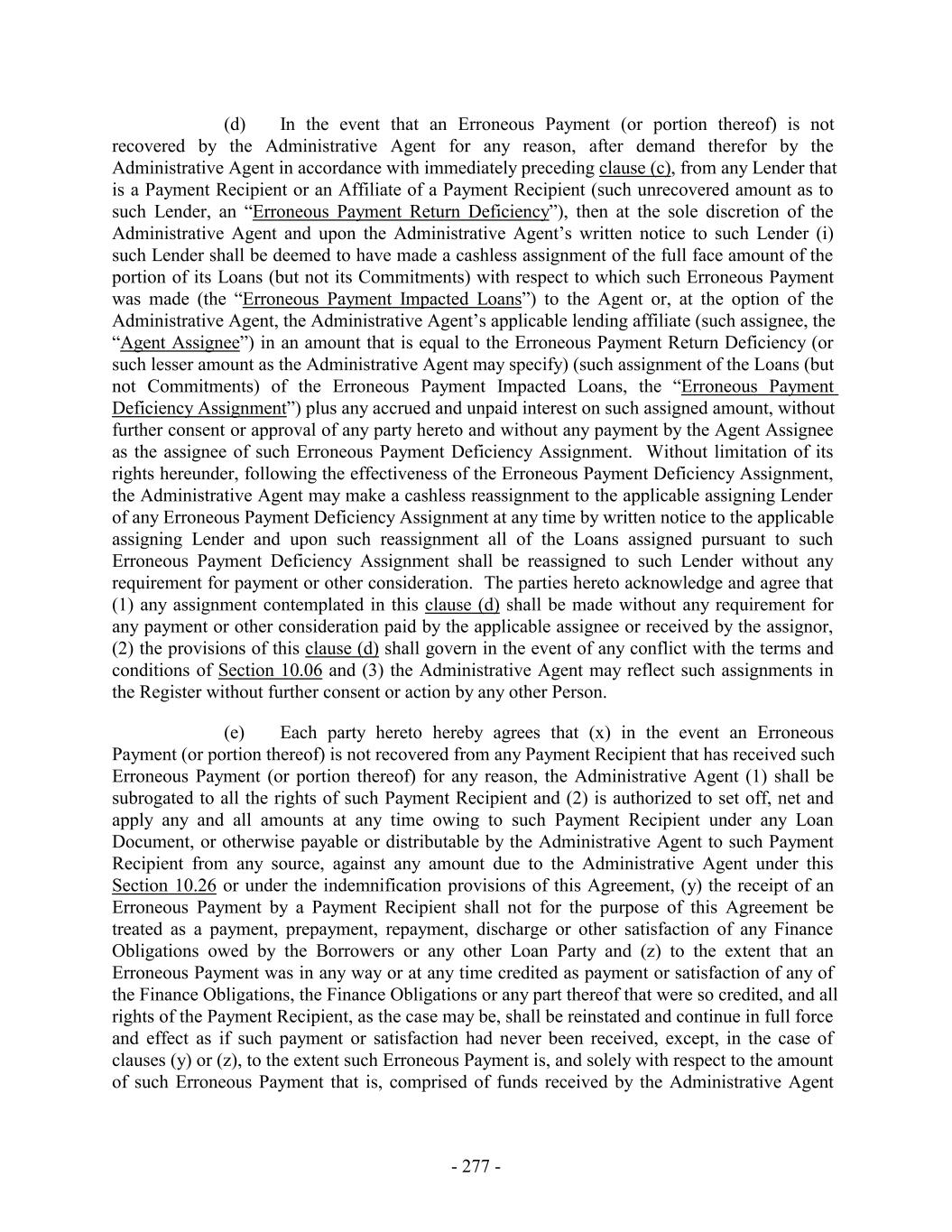 (d) In the event that an Erroneous Payment (or portion thereof) is not recovered by the Administrative Agent for any reason, after demand therefor by the Administrative Agent in accordance with immediately preceding clause (c), from any Lender that is a Payment Recipient or an Affiliate of a Payment Recipient (such unrecovered amount as to such Lender, an “Erroneous Payment Return Deficiency”), then at the sole discretion of the Administrative Agent and upon the Administrative Agent’s written notice to such Lender (i) such Lender shall be deemed to have made a cashless assignment of the full face amount of the portion of its Loans (but not its Commitments) with respect to which such Erroneous Payment was made (the “Erroneous Payment Impacted Loans”) to the Agent or, at the option of the Administrative Agent, the Administrative Agent’s applicable lending affiliate (such assignee, the “Agent Assignee”) in an amount that is equal to the Erroneous Payment Return Deficiency (or such lesser amount as the Administrative Agent may specify) (such assignment of the Loans (but not Commitments) of the Erroneous Payment Impacted Loans, the “Erroneous Payment Deficiency Assignment”) plus any accrued and unpaid interest on such assigned amount, without further consent or approval of any party hereto and without any payment by the Agent Assignee as the assignee of such Erroneous Payment Deficiency Assignment. Without limitation of its rights hereunder, following the effectiveness of the Erroneous Payment Deficiency Assignment, the Administrative Agent may make a cashless reassignment to the applicable assigning Lender of any Erroneous Payment Deficiency Assignment at any time by written notice to the applicable assigning Lender and upon such reassignment all of the Loans assigned pursuant to such Erroneous Payment Deficiency Assignment shall be reassigned to such Lender without any requirement for payment or other consideration. The parties hereto acknowledge and agree that (1) any assignment contemplated in this clause (d) shall be made without any requirement for any payment or other consideration paid by the applicable assignee or received by the assignor, (2) the provisions of this clause (d) shall govern in the event of any conflict with the terms and conditions of Section 10.06 and (3) the Administrative Agent may reflect such assignments in the Register without further consent or action by any other Person. (e) Each party hereto hereby agrees that (x) in the event an Erroneous Payment (or portion thereof) is not recovered from any Payment Recipient that has received such Erroneous Payment (or portion thereof) for any reason, the Administrative Agent (1) shall be subrogated to all the rights of such Payment Recipient and (2) is authorized to set off, net and apply any and all amounts at any time owing to such Payment Recipient under any Loan Document, or otherwise payable or distributable by the Administrative Agent to such Payment Recipient from any source, against any amount due to the Administrative Agent under this Section 10.26 or under the indemnification provisions of this Agreement, (y) the receipt of an Erroneous Payment by a Payment Recipient shall not for the purpose of this Agreement be treated as a payment, prepayment, repayment, discharge or other satisfaction of any Finance Obligations owed by the Borrowers or any other Loan Party and (z) to the extent that an Erroneous Payment was in any way or at any time credited as payment or satisfaction of any of the Finance Obligations, the Finance Obligations or any part thereof that were so credited, and all rights of the Payment Recipient, as the case may be, shall be reinstated and continue in full force and effect as if such payment or satisfaction had never been received, except, in the case of clauses (y) or (z), to the extent such Erroneous Payment is, and solely with respect to the amount of such Erroneous Payment that is, comprised of funds received by the Administrative Agent - 277 -