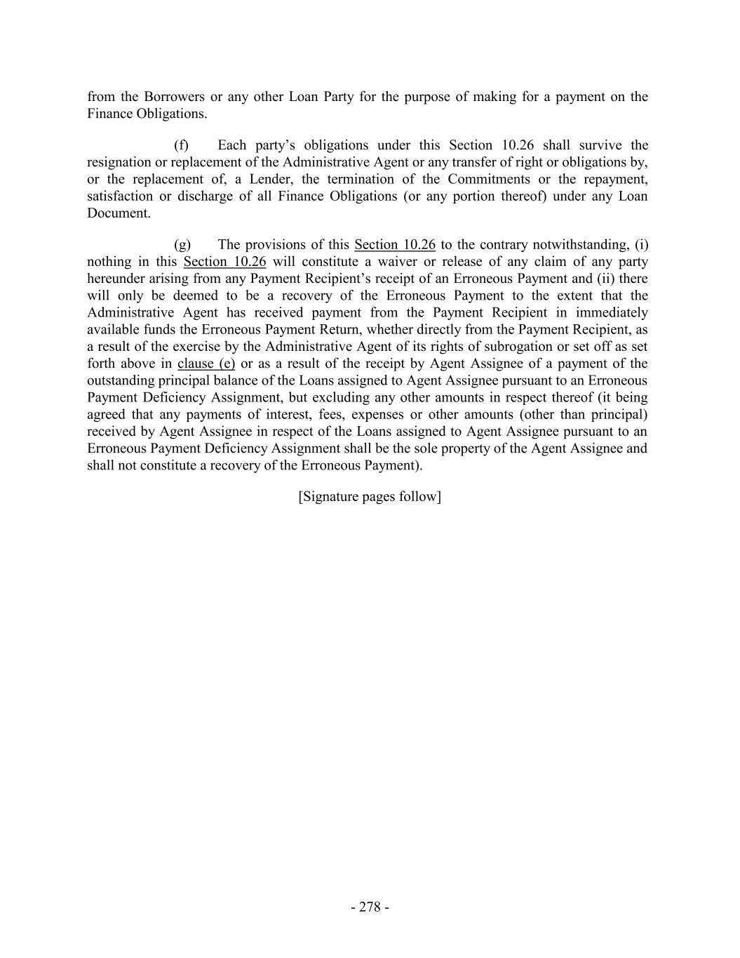 from the Borrowers or any other Loan Party for the purpose of making for a payment on the Finance Obligations. (f) Each party’s obligations under this Section 10.26 shall survive the resignation or replacement of the Administrative Agent or any transfer of right or obligations by, or the replacement of, a Lender, the termination of the Commitments or the repayment, satisfaction or discharge of all Finance Obligations (or any portion thereof) under any Loan Document. (g) The provisions of this Section 10.26 to the contrary notwithstanding, (i) nothing in this Section 10.26 will constitute a waiver or release of any claim of any party hereunder arising from any Payment Recipient’s receipt of an Erroneous Payment and (ii) there will only be deemed to be a recovery of the Erroneous Payment to the extent that the Administrative Agent has received payment from the Payment Recipient in immediately available funds the Erroneous Payment Return, whether directly from the Payment Recipient, as a result of the exercise by the Administrative Agent of its rights of subrogation or set off as set forth above in clause (e) or as a result of the receipt by Agent Assignee of a payment of the outstanding principal balance of the Loans assigned to Agent Assignee pursuant to an Erroneous Payment Deficiency Assignment, but excluding any other amounts in respect thereof (it being agreed that any payments of interest, fees, expenses or other amounts (other than principal) received by Agent Assignee in respect of the Loans assigned to Agent Assignee pursuant to an Erroneous Payment Deficiency Assignment shall be the sole property of the Agent Assignee and shall not constitute a recovery of the Erroneous Payment). [Signature pages follow] - 278 -