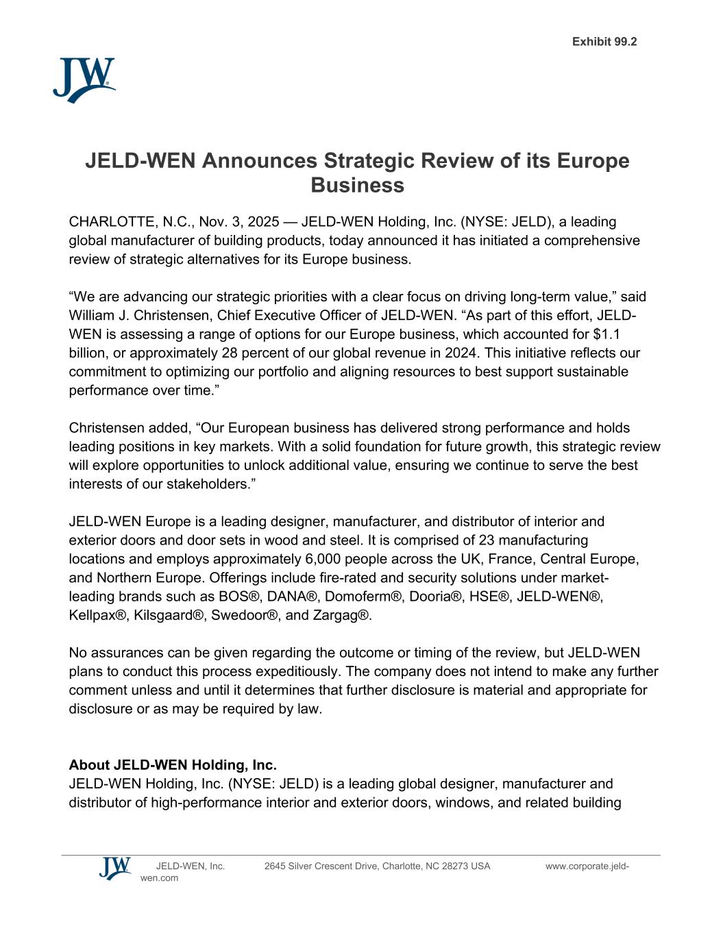 JELD-WEN, Inc. 2645 Silver Crescent Drive, Charlotte, NC 28273 USA www.corporate.jeld- wen.com JELD-WEN Announces Strategic Review of its Europe Business CHARLOTTE, N.C., Nov. 3, 2025 — JELD-WEN Holding, Inc. (NYSE: JELD), a leading global manufacturer of building products, today announced it has initiated a comprehensive review of strategic alternatives for its Europe business. “We are advancing our strategic priorities with a clear focus on driving long-term value,” said William J. Christensen, Chief Executive Officer of JELD-WEN. “As part of this effort, JELD- WEN is assessing a range of options for our Europe business, which accounted for $1.1 billion, or approximately 28 percent of our global revenue in 2024. This initiative reflects our commitment to optimizing our portfolio and aligning resources to best support sustainable performance over time.” Christensen added, “Our European business has delivered strong performance and holds leading positions in key markets. With a solid foundation for future growth, this strategic review will explore opportunities to unlock additional value, ensuring we continue to serve the best interests of our stakeholders.” JELD-WEN Europe is a leading designer, manufacturer, and distributor of interior and exterior doors and door sets in wood and steel. It is comprised of 23 manufacturing locations and employs approximately 6,000 people across the UK, France, Central Europe, and Northern Europe. Offerings include fire-rated and security solutions under market- leading brands such as BOS®, DANA®, Domoferm®, Dooria®, HSE®, JELD-WEN®, Kellpax®, Kilsgaard®, Swedoor®, and Zargag®. No assurances can be given regarding the outcome or timing of the review, but JELD-WEN plans to conduct this process expeditiously. The company does not intend to make any further comment unless and until it determines that further disclosure is material and appropriate for disclosure or as may be required by law. About JELD-WEN Holding, Inc. JELD-WEN Holding, Inc. (NYSE: JELD) is a leading global designer, manufacturer and distributor of high-performance interior and exterior doors, windows, and related building Exhibit 99.2