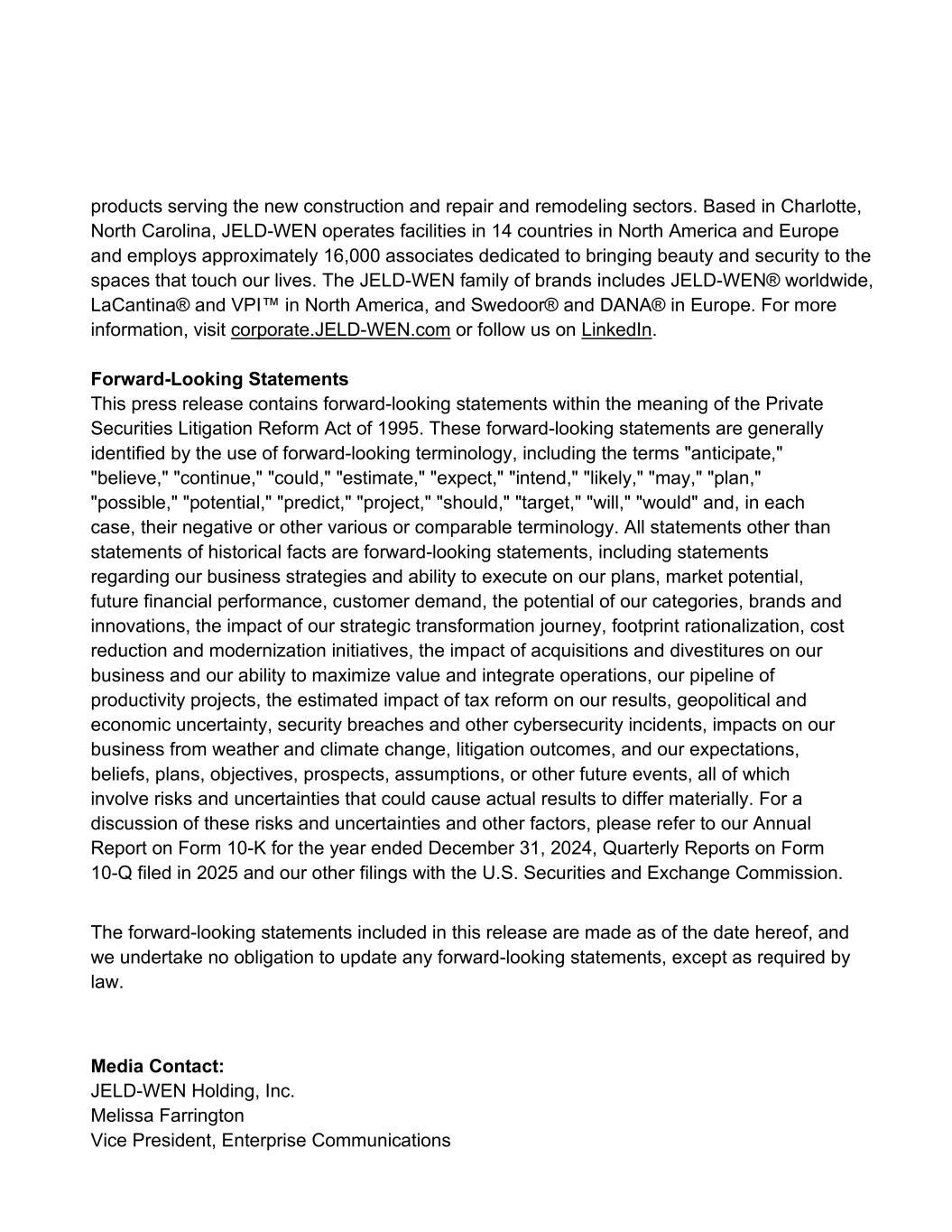 products serving the new construction and repair and remodeling sectors. Based in Charlotte, North Carolina, JELD-WEN operates facilities in 14 countries in North America and Europe and employs approximately 16,000 associates dedicated to bringing beauty and security to the spaces that touch our lives. The JELD-WEN family of brands includes JELD-WEN® worldwide, LaCantina® and VPI™ in North America, and Swedoor® and DANA® in Europe. For more information, visit corporate.JELD-WEN.com or follow us on LinkedIn. Forward-Looking Statements This press release contains forward-looking statements within the meaning of the Private Securities Litigation Reform Act of 1995. These forward-looking statements are generally identified by the use of forward-looking terminology, including the terms "anticipate," "believe," "continue," "could," "estimate," "expect," "intend," "likely," "may," "plan," "possible," "potential," "predict," "project," "should," "target," "will," "would" and, in each case, their negative or other various or comparable terminology. All statements other than statements of historical facts are forward-looking statements, including statements regarding our business strategies and ability to execute on our plans, market potential, future financial performance, customer demand, the potential of our categories, brands and innovations, the impact of our strategic transformation journey, footprint rationalization, cost reduction and modernization initiatives, the impact of acquisitions and divestitures on our business and our ability to maximize value and integrate operations, our pipeline of productivity projects, the estimated impact of tax reform on our results, geopolitical and economic uncertainty, security breaches and other cybersecurity incidents, impacts on our business from weather and climate change, litigation outcomes, and our expectations, beliefs, plans, objectives, prospects, assumptions, or other future events, all of which involve risks and uncertainties that could cause actual results to differ materially. For a discussion of these risks and uncertainties and other factors, please refer to our Annual Report on Form 10-K for the year ended December 31, 2024, Quarterly Reports on Form 10-Q filed in 2025 and our other filings with the U.S. Securities and Exchange Commission. The forward-looking statements included in this release are made as of the date hereof, and we undertake no obligation to update any forward-looking statements, except as required by law. Media Contact: JELD-WEN Holding, Inc. Melissa Farrington Vice President, Enterprise Communications