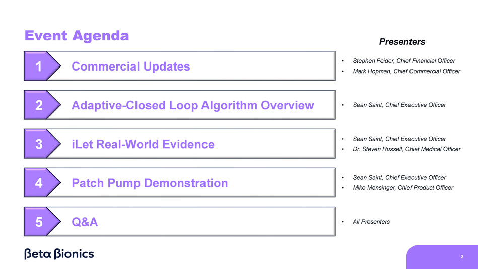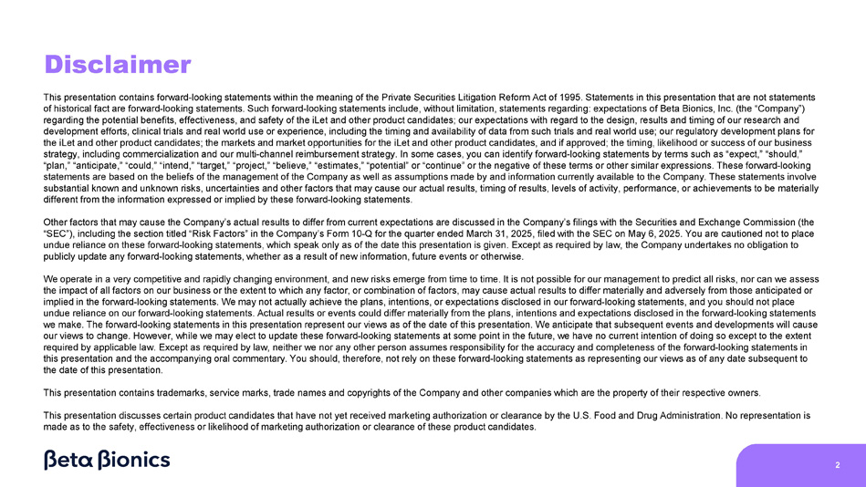 Disclaimer 2 This presentation contains forward - looking statements within the meaning of the Private Securities Litigation Reform Act of 1995. Statements in this presentation that are not statements of historical fact are forward - looking statements. Such forward - looking statements include, without limitation, statements regarding: expectations of Beta Bionics, Inc. (the “Company”) regarding the potential benefits, effectiveness, and safety of the iLet and other product candidates; our expectations with regard to the design, results and timing of our research and development efforts, clinical trials and real world use or experience, including the timing and availability of data from such trials and real world use; our regulatory development plans for the iLet and other product candidates; the markets and market opportunities for the iLet and other product candidates, and if approved; the timing, likelihood or success of our business strategy, including commercialization and our multi - channel reimbursement strategy. In some cases, you can identify forward - looking statements by terms such as “expect,” “should,” “plan,” “anticipate,” “could,” “intend,” “target,” “project,” “believe,” “estimates,” “potential” or “continue” or the negative of these terms or other similar expressions. These forward - looking statements are based on the beliefs of the management of the Company as well as assumptions made by and information currently available to the Company. These statements involve substantial known and unknown risks, uncertainties and other factors that may cause our actual results, timing of results, levels of activity, performance, or achievements to be materially different from the information expressed or implied by these forward - looking statements. Other factors that may cause the Company’s actual results to differ from current expectations are discussed in the Company’s filings with the Securities and Exchange Commission (the “SEC”), including the section titled “Risk Factors” in the Company’s Form 10 - Q for the quarter ended March 31, 2025, filed with the SEC on May 6, 2025. You are cautioned not to place undue reliance on these forward - looking statements, which speak only as of the date this presentation is given. Except as required by law, the Company undertakes no obligation to publicly update any forward - looking statements, whether as a result of new information, future events or otherwise. We operate in a very competitive and rapidly changing environment, and new risks emerge from time to time. It is not possible for our management to predict all risks, nor can we assess the impact of all factors on our business or the extent to which any factor, or combination of factors, may cause actual results to differ materially and adversely from those anticipated or implied in the forward - looking statements. We may not actually achieve the plans, intentions, or expectations disclosed in our forward - looking statements, and you should not place undue reliance on our forward - looking statements. Actual results or events could differ materially from the plans, intentions and expectations disclosed in the forward - looking statements we make. The forward - looking statements in this presentation represent our views as of the date of this presentation. We anticipate that subsequent events and developments will cause our views to change. However, while we may elect to update these forward - looking statements at some point in the future, we have no current intention of doing so except to the extent required by applicable law. Except as required by law, neither we nor any other person assumes responsibility for the accuracy and completeness of the forward - looking statements in this presentation and the accompanying oral commentary. You should, therefore, not rely on these forward - looking statements as representing our views as of any date subsequent to the date of this presentation. This presentation contains trademarks, service marks, trade names and copyrights of the Company and other companies which are the property of their respective owners. This presentation discusses certain product candidates that have not yet received marketing authorization or clearance by the U.S. Food and Drug Administration. No representation is made as to the safety, effectiveness or likelihood of marketing authorization or clearance of these product candidates.