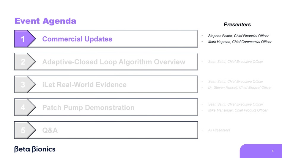 Event Agenda 1 2 5 4 3 3 Commercial Updates Q&A Adaptive - Closed Loop Algorithm Overview iLet Real - World Evidence Patch Pump Demonstration Presenters • Stephen Feider, Chief Financial Officer • Mark Hopman, Chief Commercial Officer • All Presenters • Sean Saint, Chief Executive Officer • Sean Saint, Chief Executive Officer • Dr. Steven Russell, Chief Medical Officer • Sean Saint, Chief Executive Officer • Mike Mensinger, Chief Product Officer