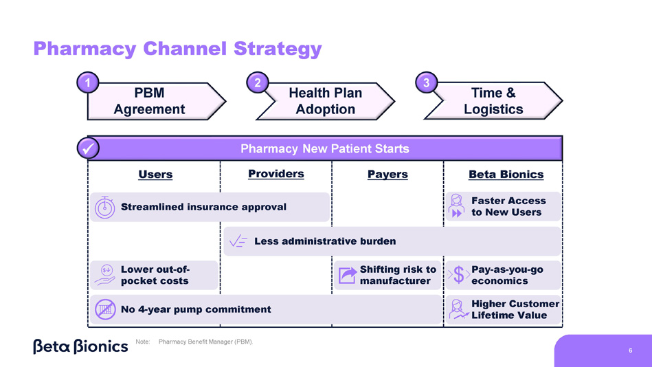 Pharmacy Channel Strategy Streamlined insurance approval Users Less administrative burden Lower out - of - pocket costs No 4 - year pump commitment Beta Bionics Faster Access to New Users Pay - as - you - go economics Higher Customer Lifetime Value Pharmacy New Patient Starts Providers Payers PBM Agreement Health Plan Adoption 1 2 Time & Logistics 3 x Shifting risk to manufacturer Note: 6 Pharmacy Benefit Manager (PBM).