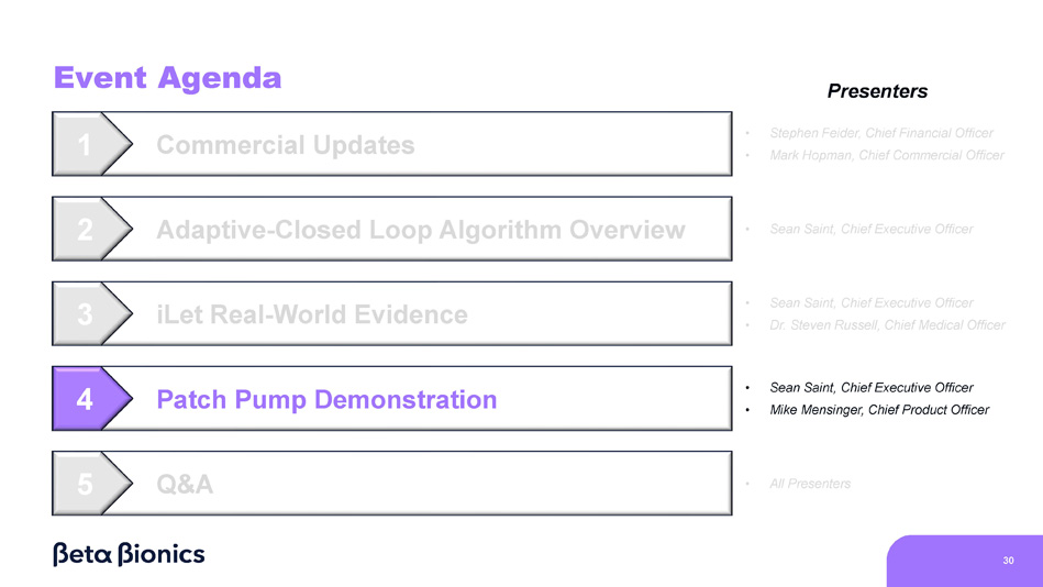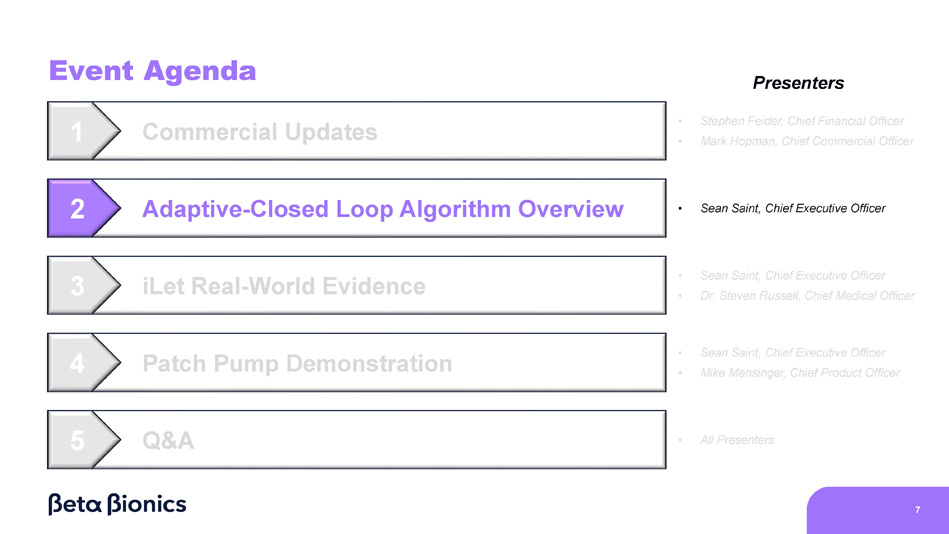Event Agenda 1 2 5 4 3 4 Commercial Updates Q&A Adaptive - Closed Loop Algorithm Overview iLet Real - World Evidence Patch Pump Demonstration Presenters • Stephen Feider, Chief Financial Officer • Mark Hopman, Chief Commercial Officer • All Presenters • Sean Saint, Chief Executive Officer • Sean Saint, Chief Executive Officer • Dr. Steven Russell, Chief Medical Officer • Sean Saint, Chief Executive Officer • Mike Mensinger, Chief Product Officer