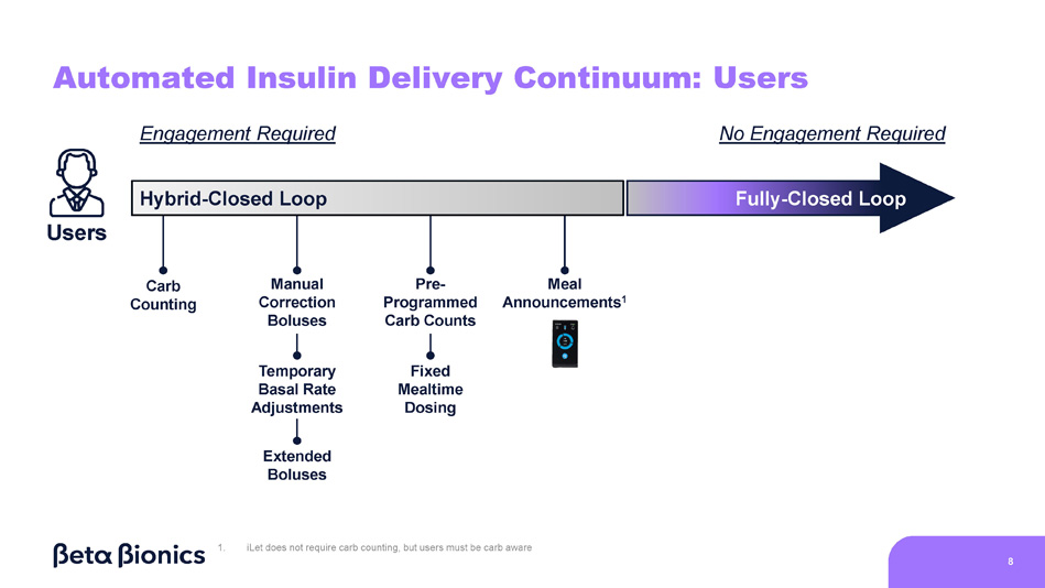 Automated Insulin Delivery Continuum: Users 1. iLet does not require carb counting, but users must be carb aware Users Engagement Required No Engagement Required Carb Counting Manual Correction Boluses Temporary Basal Rate Adjustments Fixed Mealtime Dosing Meal Announcements 1 Extended Boluses Pre - Programmed Carb Counts Hybrid - Closed Loop 8 Fully - Closed Loop