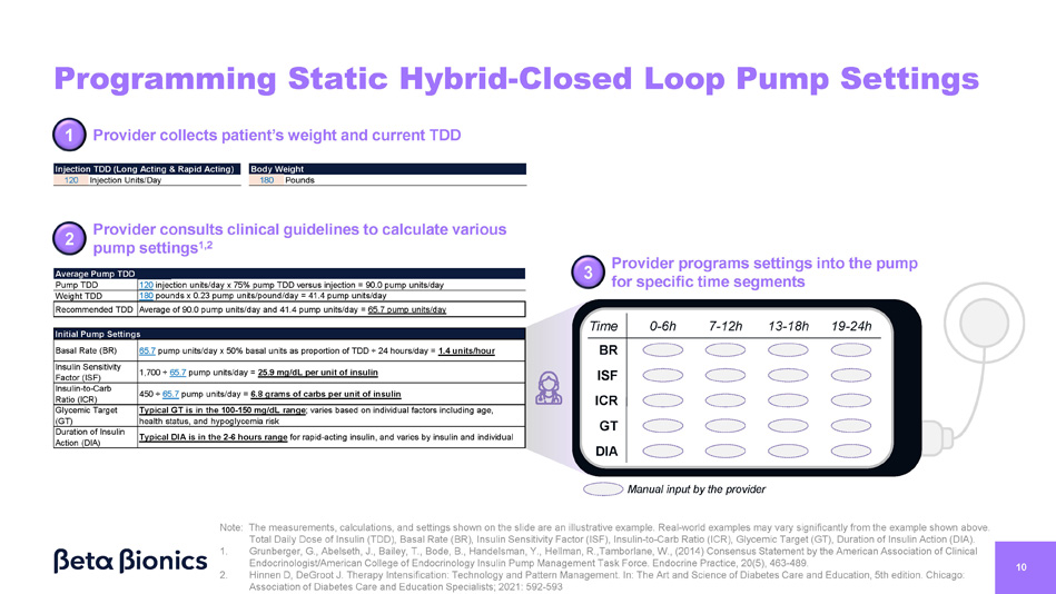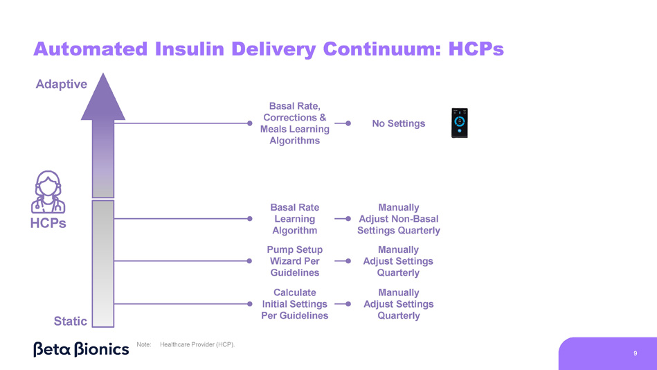 HCPs Manually Adjust Settings Quarterly Automated Insulin Delivery Continuum: HCPs Static Adaptive Basal Rate, Calculate Initial Settings Per Guidelines Manually Adjust Non - Basal Settings Quarterly Manually Adjust Settings Quarterly Basal Rate Learning Algorithm Pump Setup Wizard Per Guidelines No Settings Corrections & Meals Learning Algorithms Note: Healthcare Provider (HCP). 9