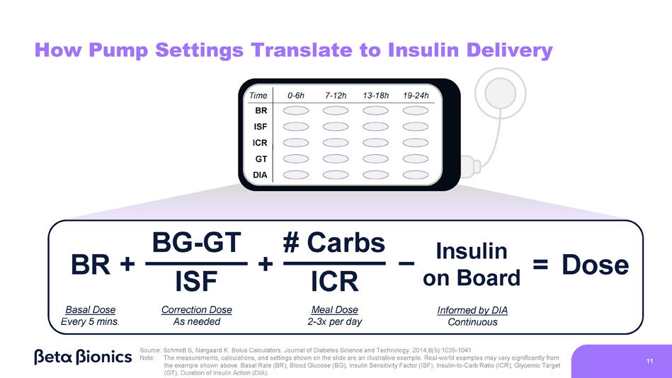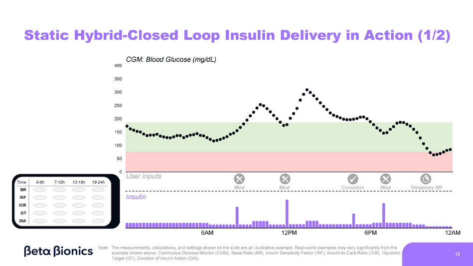 11 How Pump Settings Translate to Insulin Delivery BR ISF ICR GT DIA Time 0 - 6h 19 - 24h 7 - 12h 13 - 18h Basal Dose Every 5 mins. ISF Correction Dose As needed ICR Meal Dose 2 - 3x per day BG - GT # Carbs BR + + Insulin on Board Informed by DIA Continuous = Dose Source: Schmidt S, Nørgaard K. Bolus Calculators. Journal of Diabetes Science and Technology. 2014;8(5):1035 - 1041 Note: The measurements, calculations, and settings shown on the slide are an illustrative example . Real - world examples may vary significantly from the example shown above . Basal Rate (BR), Blood Glucose (BG), Insulin Sensitivity Factor (ISF), Insulin - to - Carb Ratio (ICR), Glycemic Target (GT), Duration of Insulin Action (DIA) .