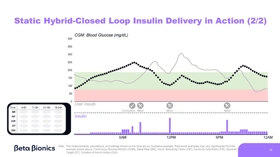 0 CGM: Blood Glucose (mg/dL) 400 350 300 250 200 150 100 50 Static Hybrid - Closed Loop Insulin Delivery in Action (1/2) Insulin User Inputs x Meal Correction Temporary BR Meal Meal 6AM 12PM 6PM 12AM Note: The measurements, calculations, and settings shown on the slide are an illustrative example. Real - world examples may vary significantly from the example shown above. Continuous Glucose Monitor (CGM), Basal Rate (BR), Insulin Sensitivity Factor (ISF), Insulin - to - Carb Ratio (ICR), Glycemic Target (GT), Duration of Insulin Action (DIA). 12