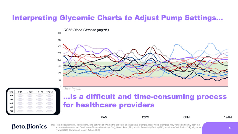 0 Static Hybrid - Closed Loop Insulin Delivery in Action (2/2) Insulin User Inputs x CGM: Blood Glucose (mg/dL) 400 350 300 250 200 150 100 50 Meal Meal Correction Meal 6AM 12PM 6PM 12AM Note: The measurements, calculations, and settings shown on the slide are an illustrative example. Real - world examples may vary significantly from the example shown above. Continuous Glucose Monitor (CGM), Basal Rate (BR), Insulin Sensitivity Factor (ISF), Insulin - to - Carb Ratio (ICR), Glycemic Target (GT), Duration of Insulin Action (DIA). 13