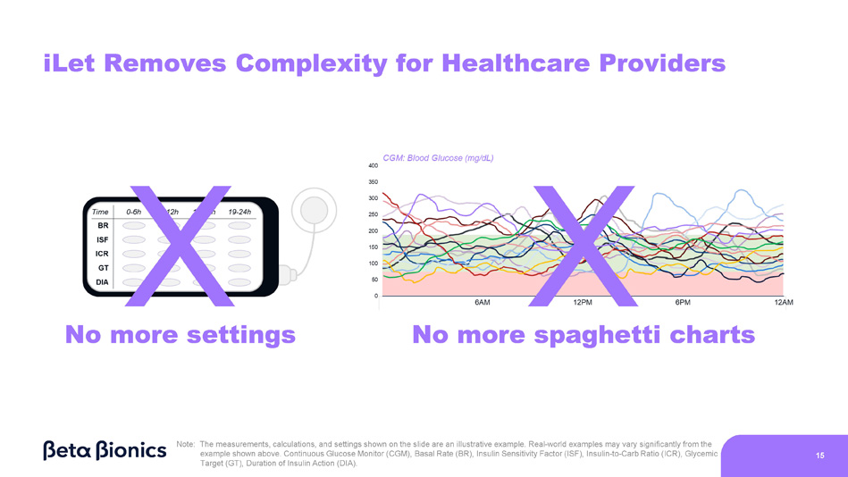 0 Interpreting Glycemic Charts to Adjust Pump Settings… Insulin CGM: Blood Glucose (mg/dL) 400 350 300 250 200 150 100 50 User Inputs …is a difficult and time - consuming process for healthcare providers 6AM 12PM 6PM 12AM Note: The measurements, calculations, and settings shown on the slide are an illustrative example. Real - world examples may vary significantly from the example shown above. Continuous Glucose Monitor (CGM), Basal Rate (BR), Insulin Sensitivity Factor (ISF), Insulin - to - Carb Ratio (ICR), Glycemic Target (GT), Duration of Insulin Action (DIA). 14