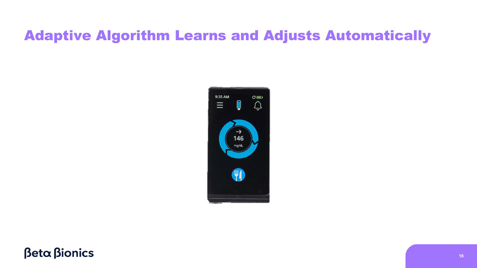 X X No more settings No more spaghetti charts Note: The measurements, calculations, and settings shown on the slide are an illustrative example. Real - world examples may vary significantly from the example shown above. Continuous Glucose Monitor (CGM), Basal Rate (BR), Insulin Sensitivity Factor (ISF), Insulin - to - Carb Ratio (ICR), Glycemic Target (GT), Duration of Insulin Action (DIA). 15 iLet Removes Complexity for Healthcare Providers