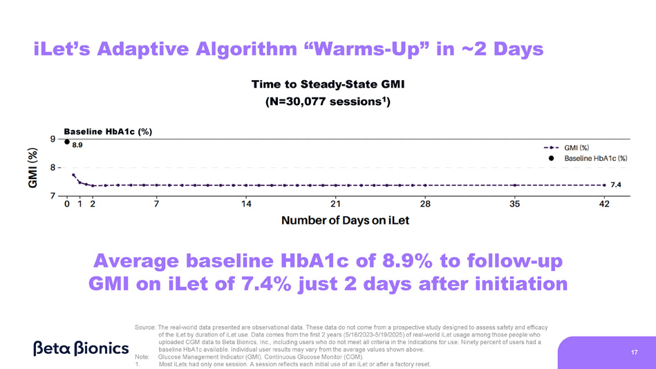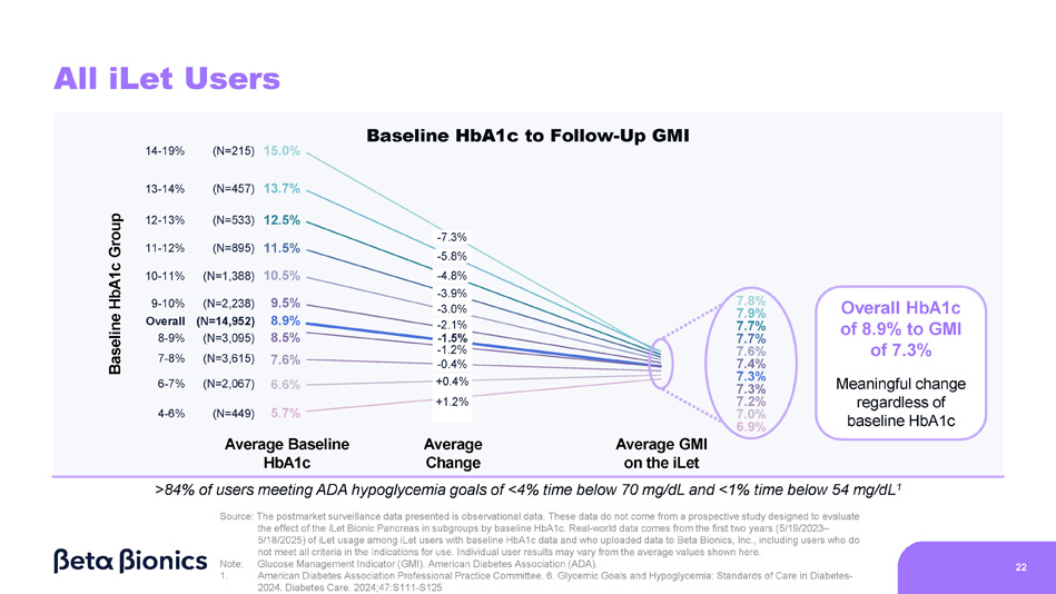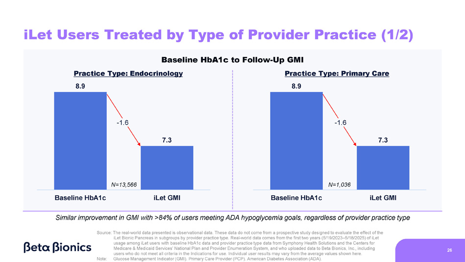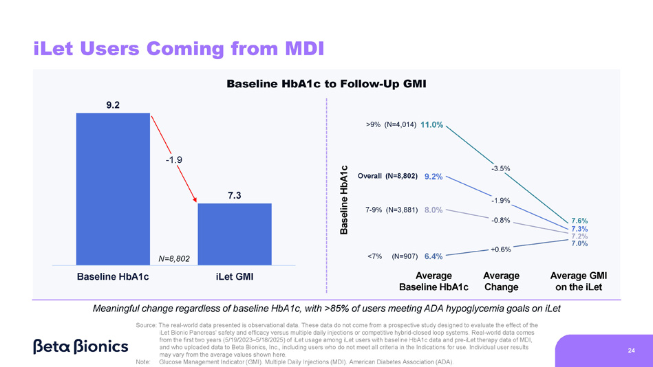 6.4% 8.1% 7.8% >9% (N=643) 10.5% Overall (N=2,910) 7 - 9% (N=1,609) <7% (N=658) - 2.8% - 0.8% - 0.6% +0.6% 8.1 7.3 Baseline HbA1c iLet GMI 25 iLet Users Coming from Competitive HCL Systems 1 7.7% 7.3% 7.2% 7.0% Baseline HbA1c to Follow - Up GMI Note: Glucose Management Indicator (GMI). Multiple Daily Injections (MDI). Hybrid - Closed Loop (HCL). American Diabetes Association (ADA). 1. Competitive HCL systems include T:slim X2, Mobi, Omnipod 5, and MiniMed 670G, 720G, 750G, 760G, 770G, and 780G Meaningful change regardless of baseline HbA1c, with >83% of users meeting ADA hypoglycemia goals on iLet Source: The real - world data presented is observational data. These data do not come from a prospective study designed to evaluate the effect of the iLet Bionic Pancreas’ safety and efficacy versus multiple daily injections or competitive hybrid - closed loop systems. Real - world data comes from the first two years (5/19/2023 – 5/18/2025) of iLet usage among iLet users with baseline HbA1c data and pre - iLet therapy data of a competitive HCL system, and who uploaded data to Beta Bionics, Inc., including users who do not meet all criteria in the Indications for use. Individual user results may vary from the average values shown here. - 0.9 Baseline HbA1c Average Baseline HbA1c Average Change Average GMI on the iLet N=2,910