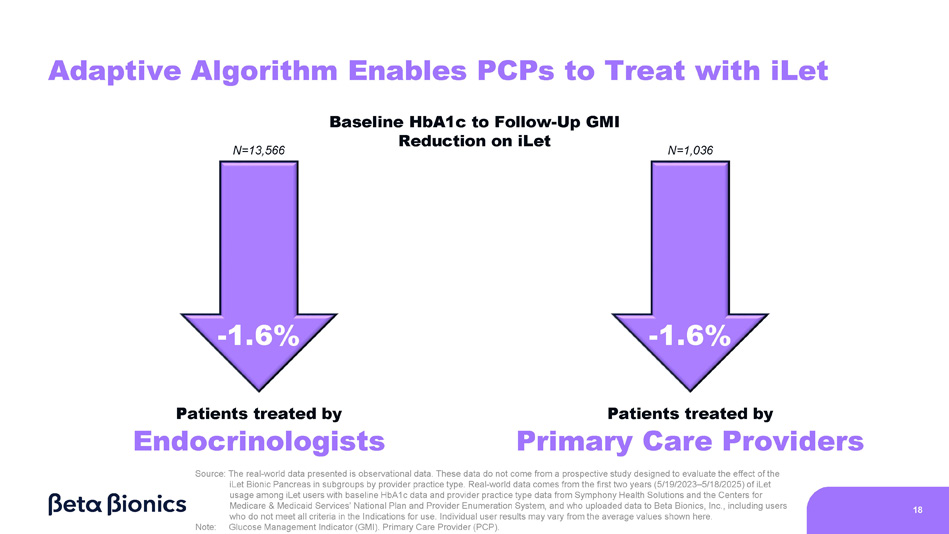 17 iLet’s Adaptive Algorithm “Warms - Up” in ~2 Days Time to Steady - State GMI (N=30,077 sessions 1 ) Source: The real - world data presented are observational data. These data do not come from a prospective study designed to assess safety and efficacy of the iLet by duration of iLet use. Data comes from the first 2 years (5/18/2023 - 5/19/2025) of real - world iLet usage among those people who uploaded CGM data to Beta Bionics, Inc., including users who do not meet all criteria in the Indications for use. Ninety percent of users had a baseline HbA1c available. Individual user results may vary from the average values shown above. Note: Glucose Management Indicator (GMI). Continuous Glucose Monitor (CGM). 1. Most iLets had only one session. A session reflects each initial use of an iLet or after a factory reset. Average baseline HbA1c of 8.9% to follow - up GMI on iLet of 7.4% just 2 days after initiation Baseline HbA1c (%)