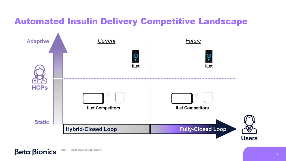 18 Adaptive Algorithm Enables PCPs to Treat with iLet - 1.6% Patients treated by Endocrinologists - 1.6% Patients treated by Primary Care Providers Source: The real - world data presented is observational data. These data do not come from a prospective study designed to evaluate the effect of the iLet Bionic Pancreas in subgroups by provider practice type. Real - world data comes from the first two years (5/19/2023 – 5/18/2025) of iLet usage among iLet users with baseline HbA1c data and provider practice type data from Symphony Health Solutions and the Centers for Medicare & Medicaid Services’ National Plan and Provider Enumeration System, and who uploaded data to Beta Bionics, Inc., including users who do not meet all criteria in the Indications for use. Individual user results may vary from the average values shown here. Note: Glucose Management Indicator (GMI). Primary Care Provider (PCP). N=13,566 N=1,036 Baseline HbA1c to Follow - Up GMI Reduction on iLet