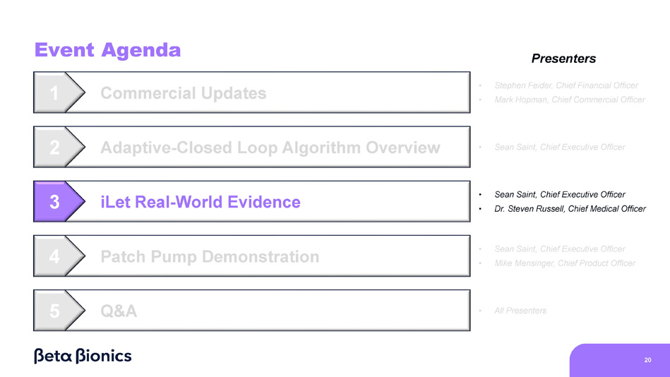 Event Agenda 1 2 5 4 3 7 Commercial Updates Q&A Adaptive - Closed Loop Algorithm Overview iLet Real - World Evidence Patch Pump Demonstration Presenters • Stephen Feider, Chief Financial Officer • Mark Hopman, Chief Commercial Officer • All Presenters • Sean Saint, Chief Executive Officer • Sean Saint, Chief Executive Officer • Dr. Steven Russell, Chief Medical Officer • Sean Saint, Chief Executive Officer • Mike Mensinger, Chief Product Officer