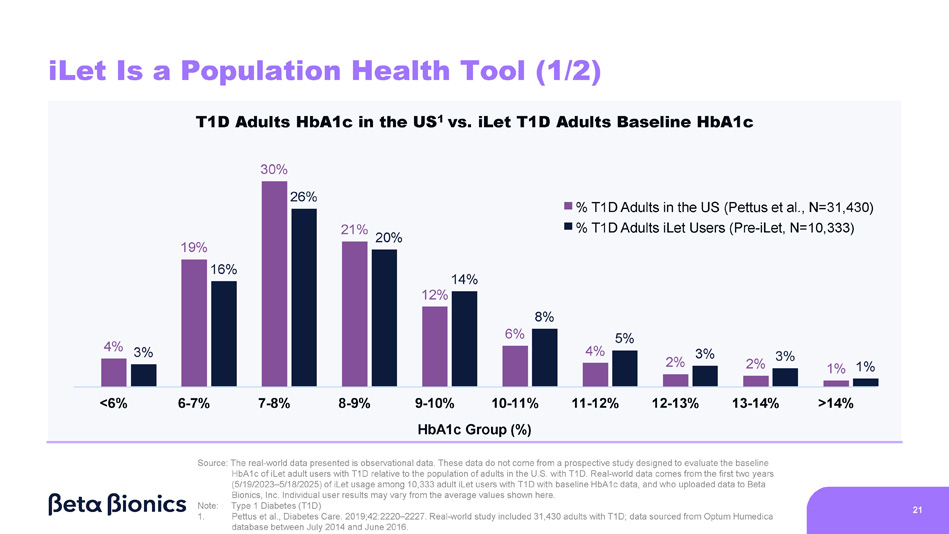 4% 19% 12% 6% 4% 2% 2% 1% <6% 6 - 7% 7 - 8% 8 - 9% 11 - 12% 12 - 13% 13 - 14% >14% 3% 16% 26% 21% 20% 14% 8% 5% 3% 3% 1% T1D Adults HbA1c in the US 1 vs. iLet T1D Adults Baseline HbA1c 30% 9 - 10% 10 - 11% HbA1c Group (%) iLet Is a Population Health Tool (1/2) 21 % T1D Adults in the US (Pettus et al., N=31,430) % T1D Adults iLet Users (Pre - iLet, N=10,333) Source: The real - world data presented is observational data. These data do not come from a prospective study designed to evaluate the baseline HbA1c of iLet adult users with T1D relative to the population of adults in the U.S. with T1D. Real - world data comes from the first two years (5/19/2023 – 5/18/2025) of iLet usage among 10,333 adult iLet users with T1D with baseline HbA1c data, and who uploaded data to Beta Bionics, Inc. Individual user results may vary from the average values shown here. Note: Type 1 Diabetes (T1D) 1. Pettus et al., Diabetes Care. 2019;42:2220 – 2227. Real - world study included 31,430 adults with T1D; data sourced from Optum Humedica database between July 2014 and June 2016.