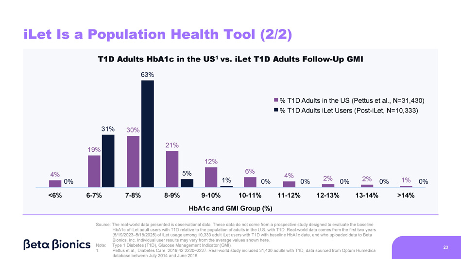 All iLet Users 22 Baseline HbA1c Group Average Baseline HbA1c Average Change Average GMI on the iLet 15.0% (N=215) 14 - 19% 13.7% (N=457) 13 - 14% 12.5% (N=533) 12 - 13% 11.5% (N=895) 11 - 12% 10.5% (N=1,388) 10 - 11% 9.5% (N=2,238) 9 - 10% 8.9% (N=14,952) Overall 8.5% (N=3,095) 8 - 9% 7.6% (N=3,615) 7 - 8% 6.6% (N=2,067) 6 - 7% 5.7% (N=449) 4 - 6% Overall HbA1c of 8.9% to GMI of 7.3% Meaningful change regardless of baseline HbA1c Note: Glucose Management Indicator (GMI). American Diabetes Association (ADA). 1. American Diabetes Association Professional Practice Committee. 6. Glycemic Goals and Hypoglycemia: Standards of Care in Diabetes - 2024. Diabetes Care. 2024;47:S111 - S125 >84% of users meeting ADA hypoglycemia goals of <4% time below 70 mg/dL and <1% time below 54 mg/dL 1 Source: The postmarket surveillance data presented is observational data. These data do not come from a prospective study designed to evaluate the effect of the iLet Bionic Pancreas in subgroups by baseline HbA1c. Real - world data comes from the first two years (5/19/2023 – 5/18/2025) of iLet usage among iLet users with baseline HbA1c data and who uploaded data to Beta Bionics, Inc., including users who do not meet all criteria in the Indications for use. Individual user results may vary from the average values shown here. - 7.3% - 5.8% - 4.8% - 3.9% - 3.0% - 2.1% - 1.5% - 1.2% - 0.4% +0.4% +1.2% Baseline HbA1c to Follow - Up GMI 7.8% 7.9% 7.7% 7.7% 7.6% 7.4% 7.3% 7.3% 7.2% 7.0% 6.9%