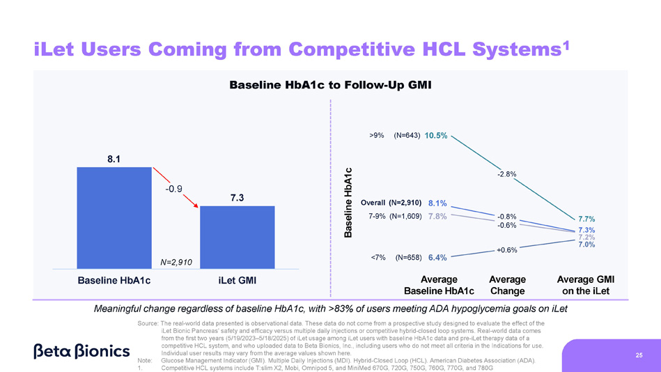24 Meaningful change regardless of baseline HbA1c, with >85% of users meeting ADA hypoglycemia goals on iLet Source: The real - world data presented is observational data. These data do not come from a prospective study designed to evaluate the effect of the iLet Bionic Pancreas’ safety and efficacy versus multiple daily injections or competitive hybrid - closed loop systems. Real - world data comes from the first two years (5/19/2023 – 5/18/2025) of iLet usage among iLet users with baseline HbA1c data and pre - iLet therapy data of MDI, and who uploaded data to Beta Bionics, Inc., including users who do not meet all criteria in the Indications for use. Individual user results may vary from the average values shown here. Note: Glucose Management Indicator (GMI). Multiple Daily Injections (MDI). American Diabetes Association (ADA). iLet Users Coming from MDI 9.2 7.3 Baseline HbA1c iLet GMI - 1.9 Baseline HbA1c to Follow - Up GMI Baseline HbA1c Average Baseline HbA1c Average Change Average GMI on the iLet 8.0% 9.2% >9% (N=4,014) 11.0% 7 - 9% (N=3,881) Overall (N=8,802) <7% (N=907) 6.4% 7.6% 7.3% 7.2% 7.0% - 3.5% - 1.9% - 0.8% +0.6% N=8,802