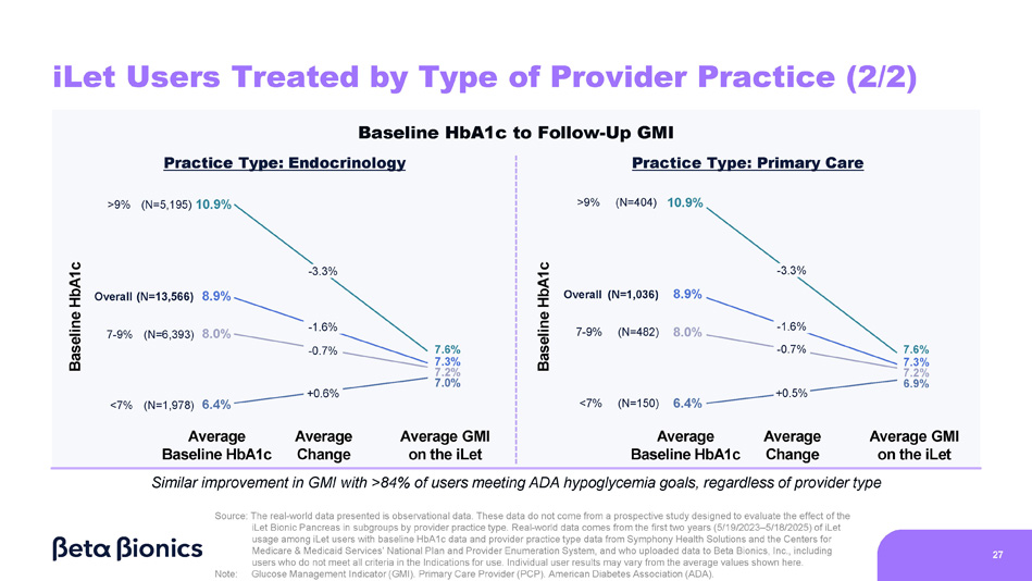 7.3 - 1.6 iLet Users Treated by Type of Provider Practice (1/2) Baseline HbA1c to Follow - Up GMI Practice Type: Primary Care 8.9 Practice Type: Endocrinology 8.9 7.3 - 1.6 N=13,566 N=1,036 Baseline HbA1c iLet GMI Baseline HbA1c iLet GMI Similar improvement in GMI with >84% of users meeting ADA hypoglycemia goals, regardless of provider practice type Source: The real - world data presented is observational data. These data do not come from a prospective study designed to evaluate the effect of the iLet Bionic Pancreas in subgroups by provider practice type. Real - world data comes from the first two years (5/19/2023 – 5/18/2025) of iLet usage among iLet users with baseline HbA1c data and provider practice type data from Symphony Health Solutions and the Centers for Medicare & Medicaid Services’ National Plan and Provider Enumeration System, and who uploaded data to Beta Bionics, Inc., including users who do not meet all criteria in the Indications for use. Individual user results may vary from the average values shown here. 26 Note: Glucose Management Indicator (GMI). Primary Care Provider (PCP). American Diabetes Association (ADA).