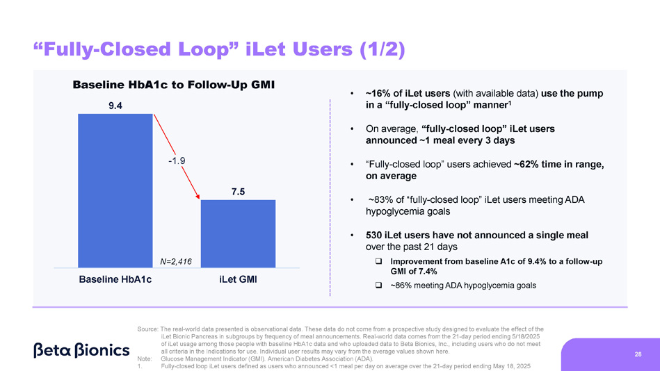 iLet Users Treated by Type of Provider Practice (2/2) Baseline HbA1c 7.6% 7.3% 7.2% 7.0% - 3.3% - 1.6% - 0.7% +0.6% Average Change Average GMI on the iLet Average Baseline HbA1c <7% (N=1,978) 6.4% >9% (N=5,195) 10.9% 7 - 9% (N=6,393) 8.0% Overall (N=13,566) 8.9% Average Baseline HbA1c Average Change Average GMI on the iLet 7.6% 7.3% 7.2% 6.9% 10.9% 8.0% 8.9% >9% (N=404) 7 - 9% (N=482) Overall (N=1,036) <7% (N=150) 6.4% - 3.3% - 1.6% - 0.7% +0.5% Baseline HbA1c Baseline HbA1c to Follow - Up GMI Practice Type: Endocrinology Practice Type: Primary Care Similar improvement in GMI with >84% of users meeting ADA hypoglycemia goals, regardless of provider type Source: The real - world data presented is observational data. These data do not come from a prospective study designed to evaluate the effect of the iLet Bionic Pancreas in subgroups by provider practice type. Real - world data comes from the first two years (5/19/2023 – 5/18/2025) of iLet usage among iLet users with baseline HbA1c data and provider practice type data from Symphony Health Solutions and the Centers for Medicare & Medicaid Services’ National Plan and Provider Enumeration System, and who uploaded data to Beta Bionics, Inc., including users who do not meet all criteria in the Indications for use. Individual user results may vary from the average values shown here. 27 Note: Glucose Management Indicator (GMI). Primary Care Provider (PCP). American Diabetes Association (ADA).