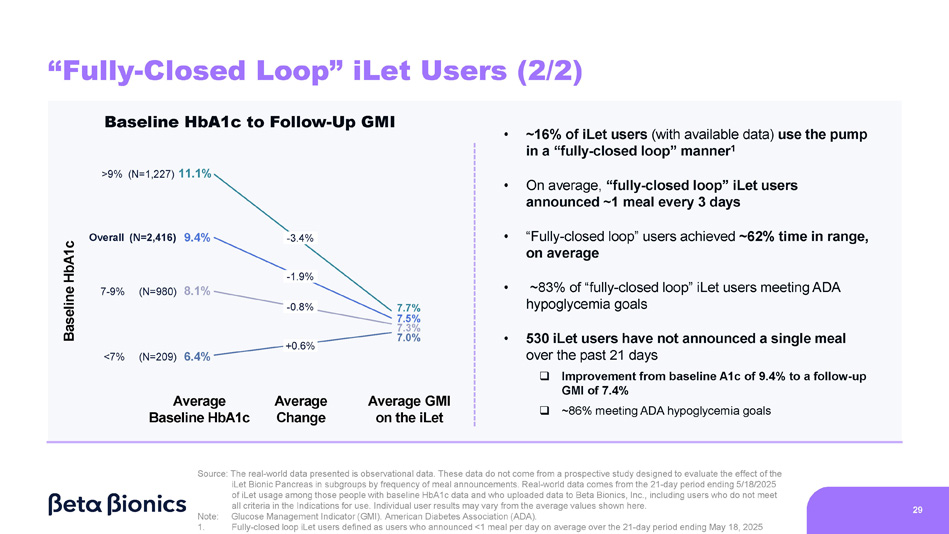 7.5 Baseline HbA1c iLet GMI - 1.9 Baseline HbA1c to Follow - Up GMI 9.4 “Fully - Closed Loop” iLet Users (1/2) • ~16% of iLet users (with available data) use the pump in a “fully - closed loop” manner 1 • On average, “fully - closed loop” iLet users announced ~1 meal every 3 days • “Fully - closed loop” users achieved ~62% time in range, on average • ~83% of “fully - closed loop” iLet users meeting ADA hypoglycemia goals • 530 iLet users have not announced a single meal over the past 21 days □ Improvement from baseline A1c of 9.4% to a follow - up GMI of 7.4% □ ~86% meeting ADA hypoglycemia goals Source: The real - world data presented is observational data. These data do not come from a prospective study designed to evaluate the effect of the iLet Bionic Pancreas in subgroups by frequency of meal announcements. Real - world data comes from the 21 - day period ending 5/18/2025 of iLet usage among those people with baseline HbA1c data and who uploaded data to Beta Bionics, Inc., including users who do not meet all criteria in the Indications for use. Individual user results may vary from the average values shown here. 28 Note: 1. Glucose Management Indicator (GMI). American Diabetes Association (ADA). Fully - closed loop iLet users defined as users who announced <1 meal per day on average over the 21 - day period ending May 18, 2025 N=2,416