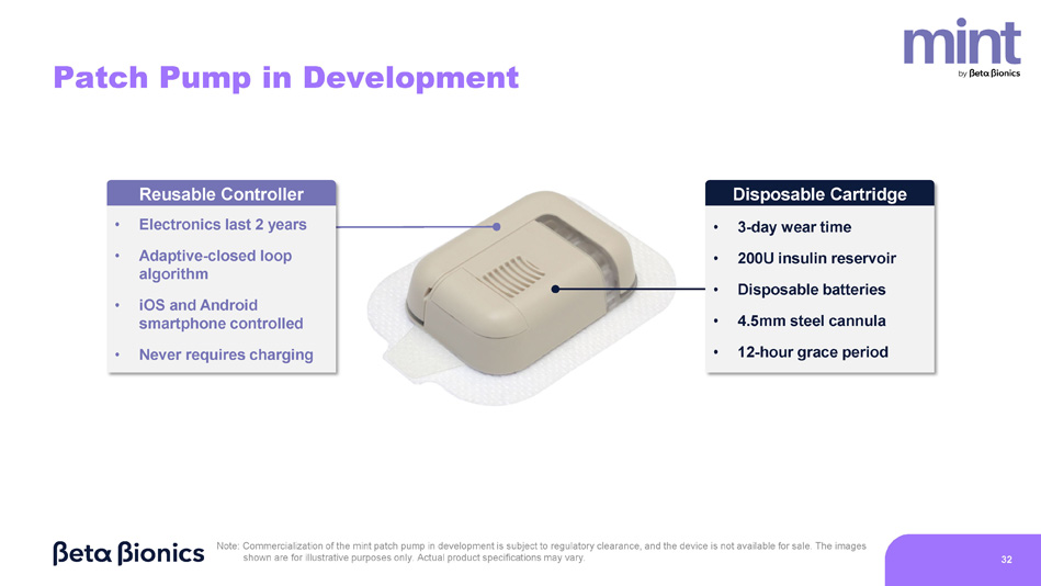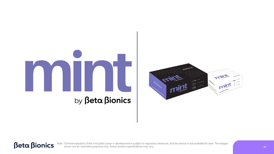 Note: Commercialization of the mint patch pump in development is subject to regulatory clearance, and the device is not available for sale. The images shown are for illustrative purposes only. Actual product specifications may vary. 31