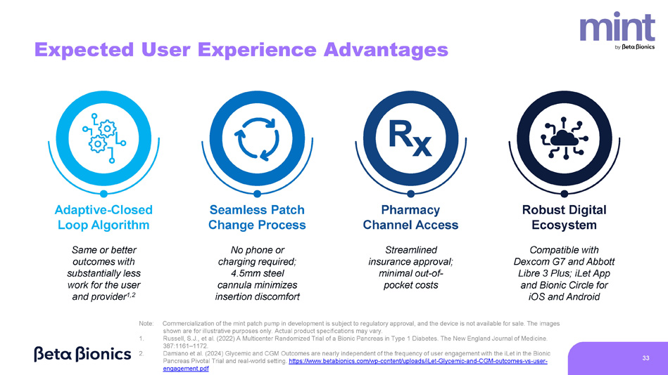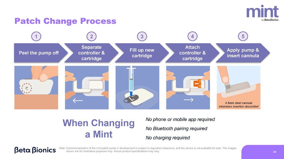 33 Adaptive - Closed Loop Algorithm Seamless Patch Change Process Pharmacy Channel Access Robust Digital Ecosystem Same or better outcomes with substantially less work for the user and provider 1,2 No phone or charging required; 4.5mm steel cannula minimizes insertion discomfort Streamlined insurance approval; minimal out - of - pocket costs Compatible with Dexcom G7 and Abbott Libre 3 Plus; iLet App and Bionic Circle for iOS and Android Expected User Experience Advantages Note: Commercialization of the mint patch pump in development is subject to regulatory approval, and the device is not available for sale. The images shown are for illustrative purposes only. Actual product specifications may vary. Russell, S.J., et al. (2022) A Multicenter Randomized Trial of a Bionic Pancreas in Type 1 Diabetes. The New England Journal of Medicine. 387:1161 – 1172. Damiano et al. (2024) Glycemic and CGM Outcomes are nearly independent of the frequency of user engagement with the iLet in the Bionic Pancreas Pivotal Trial and real - world setting. https://www.betabionics.com/wp - content/uploads/iLet - Glycemic - and - CGM - outcomes - vs - user - engagement.pdf 1. 2.