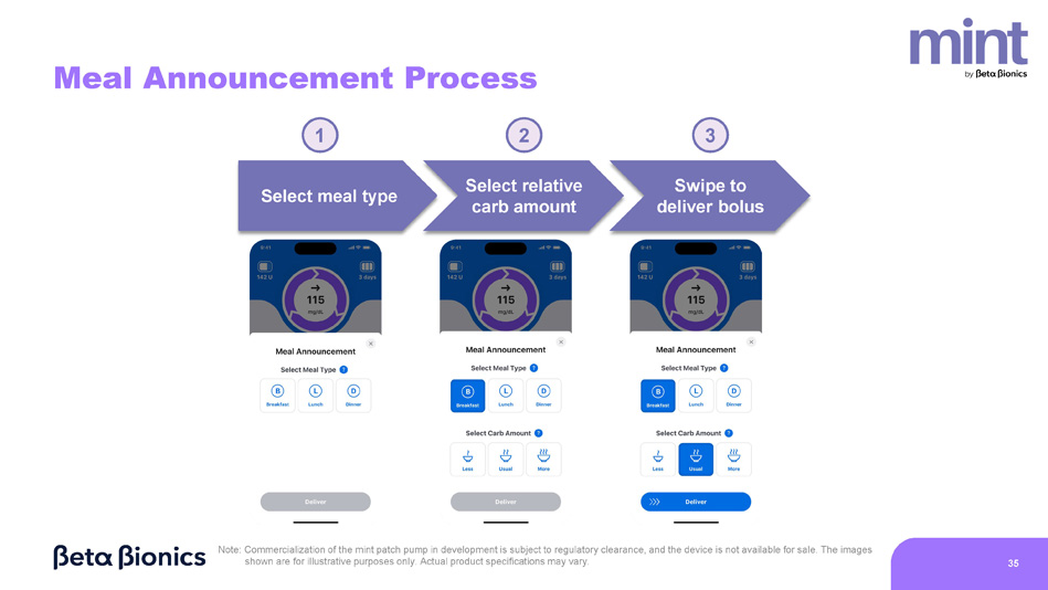 Meal Announcement Process Select relative carb amount 1 2 Swipe to deliver bolus 3 Select meal type Note: Commercialization of the mint patch pump in development is subject to regulatory clearance, and the device is not available for sale. The images shown are for illustrative purposes only. Actual product specifications may vary. 35