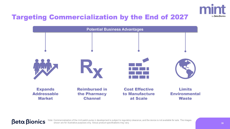 Potential Business Advantages Targeting Commercialization by the End of 2027 Expands Addressable Market R x Reimbursed in the Pharmacy Channel Cost Effective to Manufacture at Scale Limits Environmental Waste Note: Commercialization of the mint patch pump in development is subject to regulatory clearance, and the device is not available for sale. The images shown are for illustrative purposes only. Actual product specifications may vary. 36