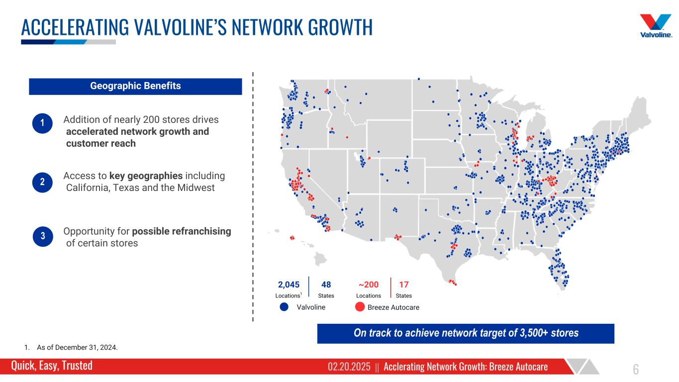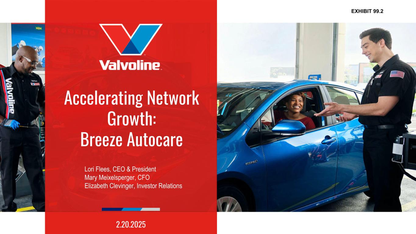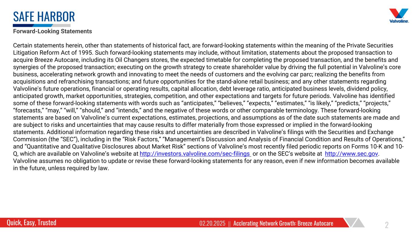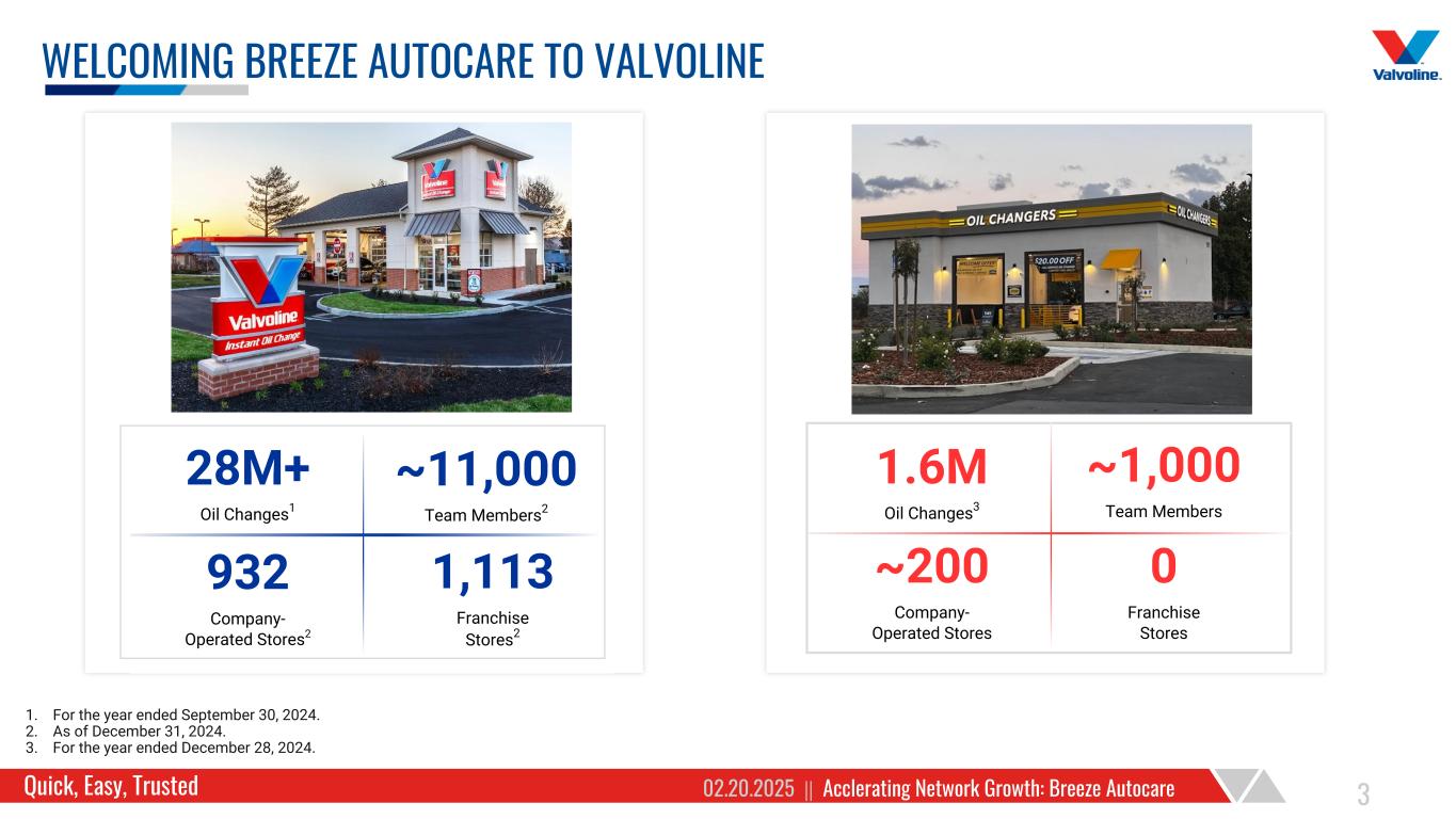 2Quick, Easy, Trusted 02.20.2025 || Acclerating Network Growth: Breeze Autocare SAFE HARBOR Forward-Looking Statements Certain statements herein, other than statements of historical fact, are forward-looking statements within the meaning of the Private Securities Litigation Reform Act of 1995. Such forward-looking statements may include, without limitation, statements about the proposed transaction to acquire Breeze Autocare, including its Oil Changers stores, the expected timetable for completing the proposed transaction, and the benefits and synergies of the proposed transaction; executing on the growth strategy to create shareholder value by driving the full potential in Valvoline’s core business, accelerating network growth and innovating to meet the needs of customers and the evolving car parc; realizing the benefits from acquisitions and refranchising transactions; and future opportunities for the stand-alone retail business; and any other statements regarding Valvoline's future operations, financial or operating results, capital allocation, debt leverage ratio, anticipated business levels, dividend policy, anticipated growth, market opportunities, strategies, competition, and other expectations and targets for future periods. Valvoline has identified some of these forward-looking statements with words such as “anticipates,” “believes,” “expects,” “estimates,” “is likely,” “predicts,” “projects,” “forecasts,” “may,” “will,” “should,” and “intends,” and the negative of these words or other comparable terminology. These forward-looking statements are based on Valvoline’s current expectations, estimates, projections, and assumptions as of the date such statements are made and are subject to risks and uncertainties that may cause results to differ materially from those expressed or implied in the forward-looking statements. Additional information regarding these risks and uncertainties are described in Valvoline’s filings with the Securities and Exchange Commission (the “SEC”), including in the “Risk Factors,” “Management’s Discussion and Analysis of Financial Condition and Results of Operations,” and “Quantitative and Qualitative Disclosures about Market Risk” sections of Valvoline’s most recently filed periodic reports on Forms 10-K and 10- Q, which are available on Valvoline’s website at http://investors.valvoline.com/sec-filings or on the SEC’s website at http://www.sec.gov. Valvoline assumes no obligation to update or revise these forward-looking statements for any reason, even if new information becomes available in the future, unless required by law.