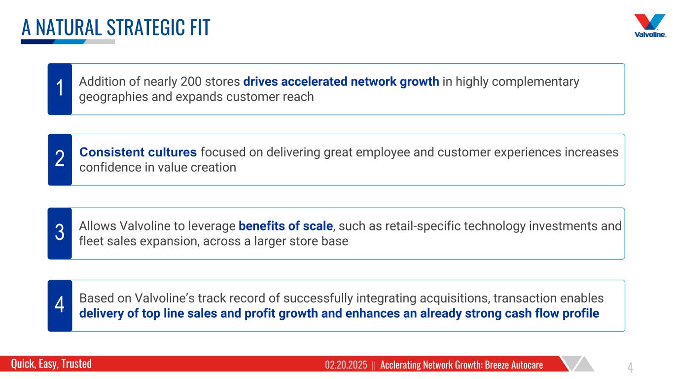 3Quick, Easy, Trusted 02.20.2025 || Acclerating Network Growth: Breeze Autocare WELCOMING BREEZE AUTOCARE TO VALVOLINE 28M+ Oil Changes1 ~11,000 Team Members2 932 Company- Operated Stores2 1,113 Franchise Stores2 1.6M Oil Changes3 ~1,000 Team Members ~200 Company- Operated Stores 0 Franchise Stores 1. For the year ended September 30, 2024. 2. As of December 31, 2024. 3. For the year ended December 28, 2024.