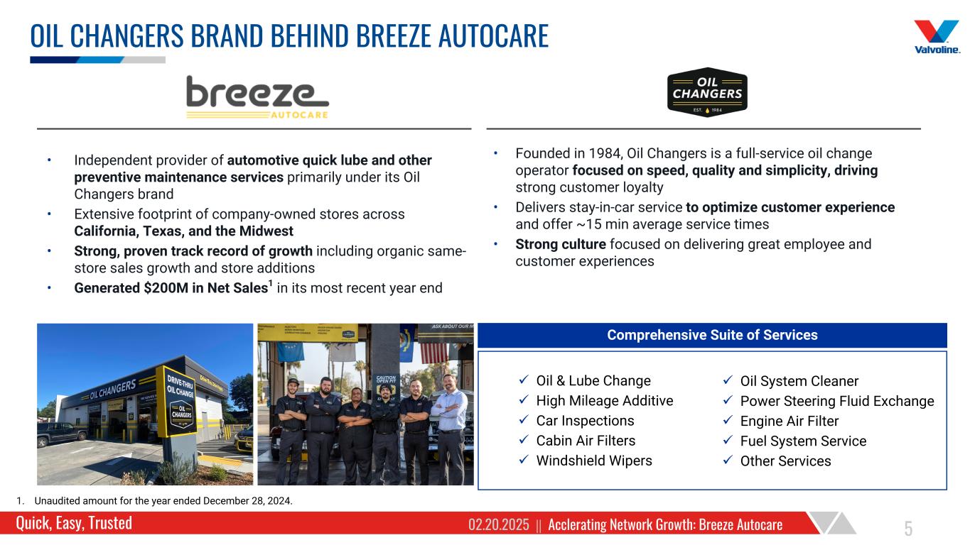 4Quick, Easy, Trusted 02.20.2025 || Acclerating Network Growth: Breeze Autocare A NATURAL STRATEGIC FIT Addition of nearly 200 stores drives accelerated network growth in highly complementary geographies and expands customer reach Consistent cultures focused on delivering great employee and customer experiences increases confidence in value creation Allows Valvoline to leverage benefits of scale, such as retail-specific technology investments and fleet sales expansion, across a larger store base 1 2 3 Based on Valvoline’s track record of successfully integrating acquisitions, transaction enables delivery of top line sales and profit growth and enhances an already strong cash flow profile4