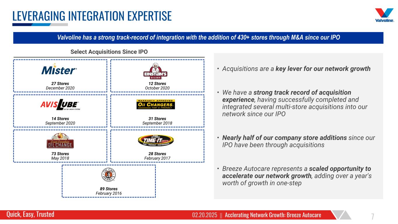 6Quick, Easy, Trusted 02.20.2025 || Acclerating Network Growth: Breeze Autocare ACCELERATING VALVOLINE’S NETWORK GROWTH Addition of nearly 200 stores drives accelerated network growth and customer reach Access to key geographies including California, Texas and the Midwest Opportunity for possible refranchising of certain stores Geographic Benefits 1 2 3 2,045 Locations1 48 States Valvoline ~200 Locations 17 States Breeze Autocare On track to achieve network target of 3,500+ stores 1. As of December 31, 2024.