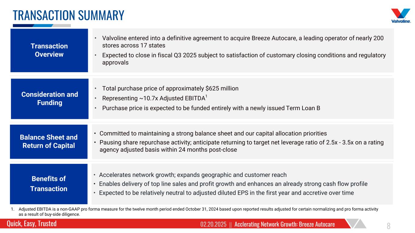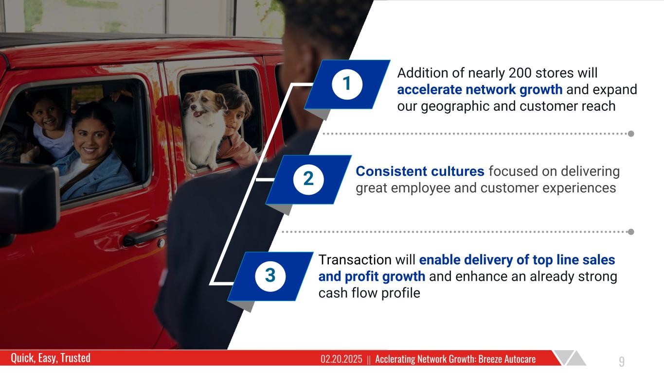 8Quick, Easy, Trusted 02.20.2025 || Acclerating Network Growth: Breeze Autocare TRANSACTION SUMMARY Transaction Overview • Valvoline entered into a definitive agreement to acquire Breeze Autocare, a leading operator of nearly 200 stores across 17 states • Expected to close in fiscal Q3 2025 subject to satisfaction of customary closing conditions and regulatory approvals Consideration and Funding • Total purchase price of approximately $625 million • Representing ~10.7x Adjusted EBITDA1 • Purchase price is expected to be funded entirely with a newly issued Term Loan B Balance Sheet and Return of Capital • Committed to maintaining a strong balance sheet and our capital allocation priorities • Pausing share repurchase activity; anticipate returning to target net leverage ratio of 2.5x - 3.5x on a rating agency adjusted basis within 24 months post-close Benefits of Transaction • Accelerates network growth; expands geographic and customer reach • Enables delivery of top line sales and profit growth and enhances an already strong cash flow profile • Expected to be relatively neutral to adjusted diluted EPS in the first year and accretive over time 1. Adjusted EBITDA is a non-GAAP pro forma measure for the twelve month period ended October 31, 2024 based upon reported results adjusted for certain normalizing and pro forma activity as a result of buy-side diligence.