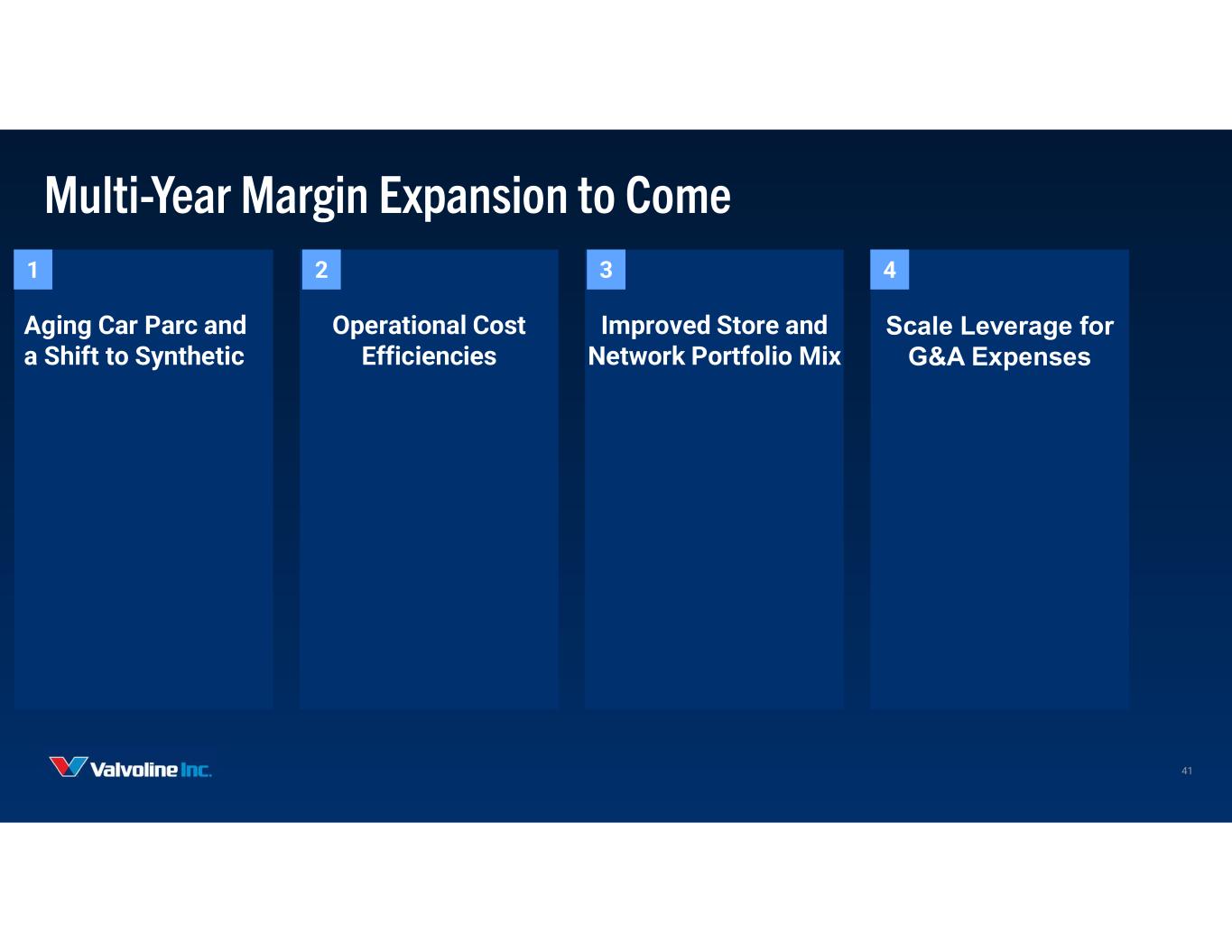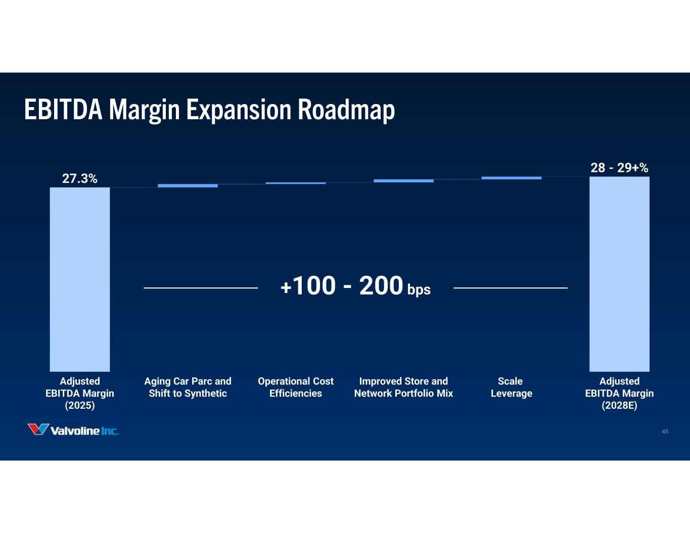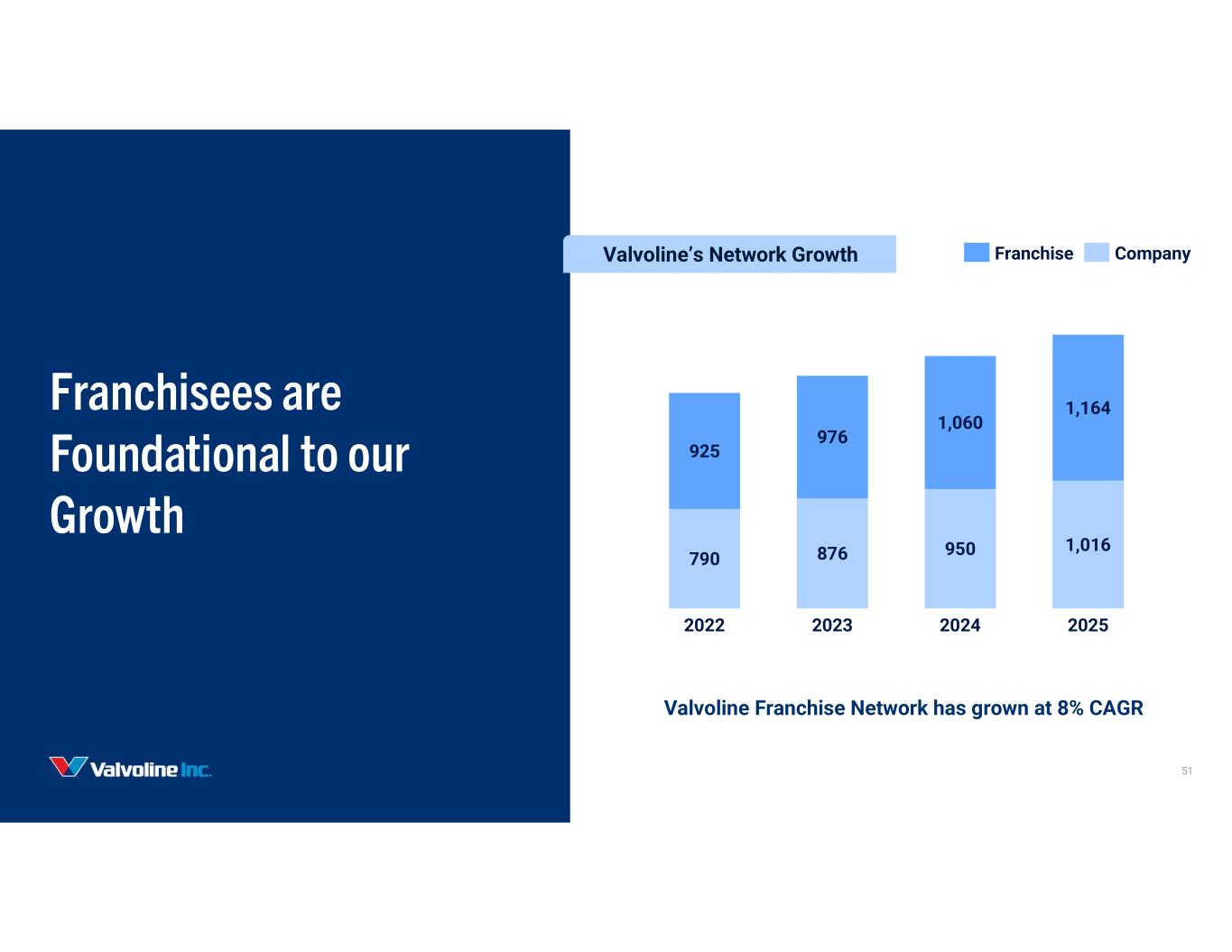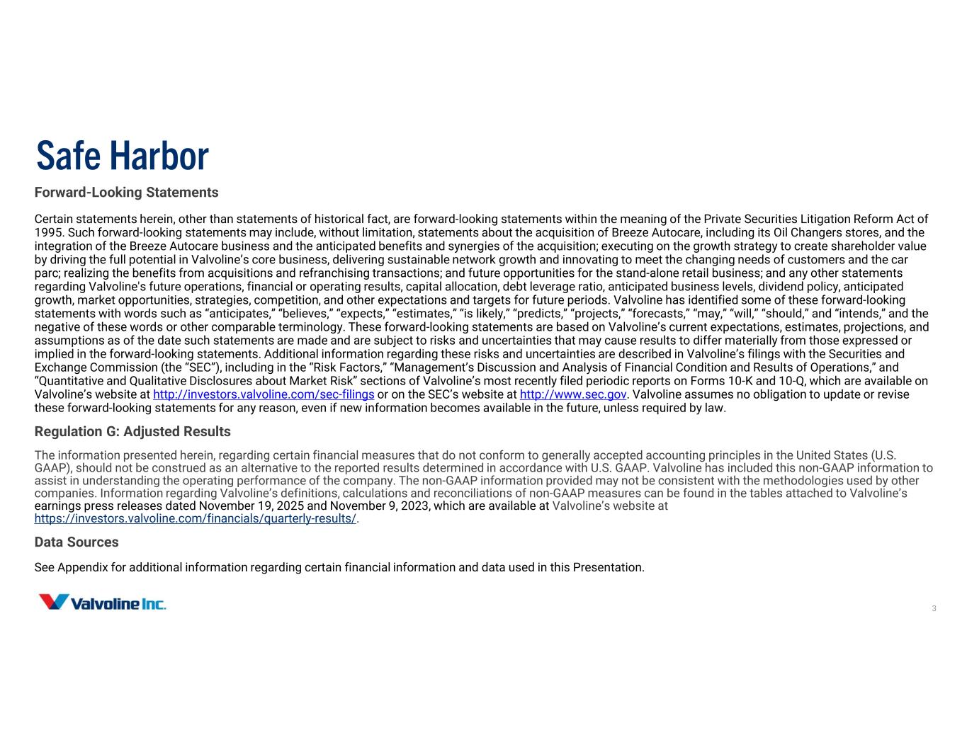 Safe Harbor 3 Forward-Looking Statements Certain statements herein, other than statements of historical fact, are forward-looking statements within the meaning of the Private Securities Litigation Reform Act of 1995. Such forward-looking statements may include, without limitation, statements about the acquisition of Breeze Autocare, including its Oil Changers stores, and the integration of the Breeze Autocare business and the anticipated benefits and synergies of the acquisition; executing on the growth strategy to create shareholder value by driving the full potential in Valvoline’s core business, delivering sustainable network growth and innovating to meet the changing needs of customers and the car parc; realizing the benefits from acquisitions and refranchising transactions; and future opportunities for the stand-alone retail business; and any other statements regarding Valvoline's future operations, financial or operating results, capital allocation, debt leverage ratio, anticipated business levels, dividend policy, anticipated growth, market opportunities, strategies, competition, and other expectations and targets for future periods. Valvoline has identified some of these forward-looking statements with words such as “anticipates,” “believes,” “expects,” “estimates,” “is likely,” “predicts,” “projects,” “forecasts,” “may,” “will,” “should,” and “intends,” and the negative of these words or other comparable terminology. These forward-looking statements are based on Valvoline’s current expectations, estimates, projections, and assumptions as of the date such statements are made and are subject to risks and uncertainties that may cause results to differ materially from those expressed or implied in the forward-looking statements. Additional information regarding these risks and uncertainties are described in Valvoline’s filings with the Securities and Exchange Commission (the “SEC”), including in the “Risk Factors,” “Management’s Discussion and Analysis of Financial Condition and Results of Operations,” and “Quantitative and Qualitative Disclosures about Market Risk” sections of Valvoline’s most recently filed periodic reports on Forms 10-K and 10-Q, which are available on Valvoline’s website at http://investors.valvoline.com/sec-filings or on the SEC’s website at http://www.sec.gov. Valvoline assumes no obligation to update or revise these forward-looking statements for any reason, even if new information becomes available in the future, unless required by law. Regulation G: Adjusted Results The information presented herein, regarding certain financial measures that do not conform to generally accepted accounting principles in the United States (U.S. GAAP), should not be construed as an alternative to the reported results determined in accordance with U.S. GAAP. Valvoline has included this non-GAAP information to assist in understanding the operating performance of the company. The non-GAAP information provided may not be consistent with the methodologies used by other companies. Information regarding Valvoline’s definitions, calculations and reconciliations of non-GAAP measures can be found in the tables attached to Valvoline’s earnings press releases dated November 19, 2025 and November 9, 2023, which are available at Valvoline’s website at https://investors.valvoline.com/financials/quarterly-results/. Data Sources See Appendix for additional information regarding certain financial information and data used in this Presentation.