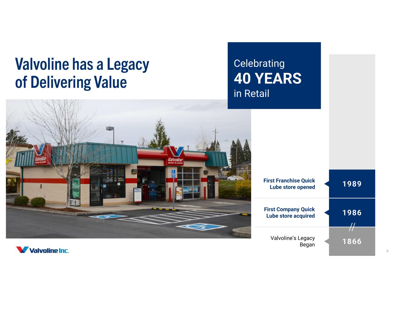 Valvoline has a Legacy of Delivering Value Valvoline’s Legacy Began 1866 1986 1989 2016 2021 2023 TODAY 7
