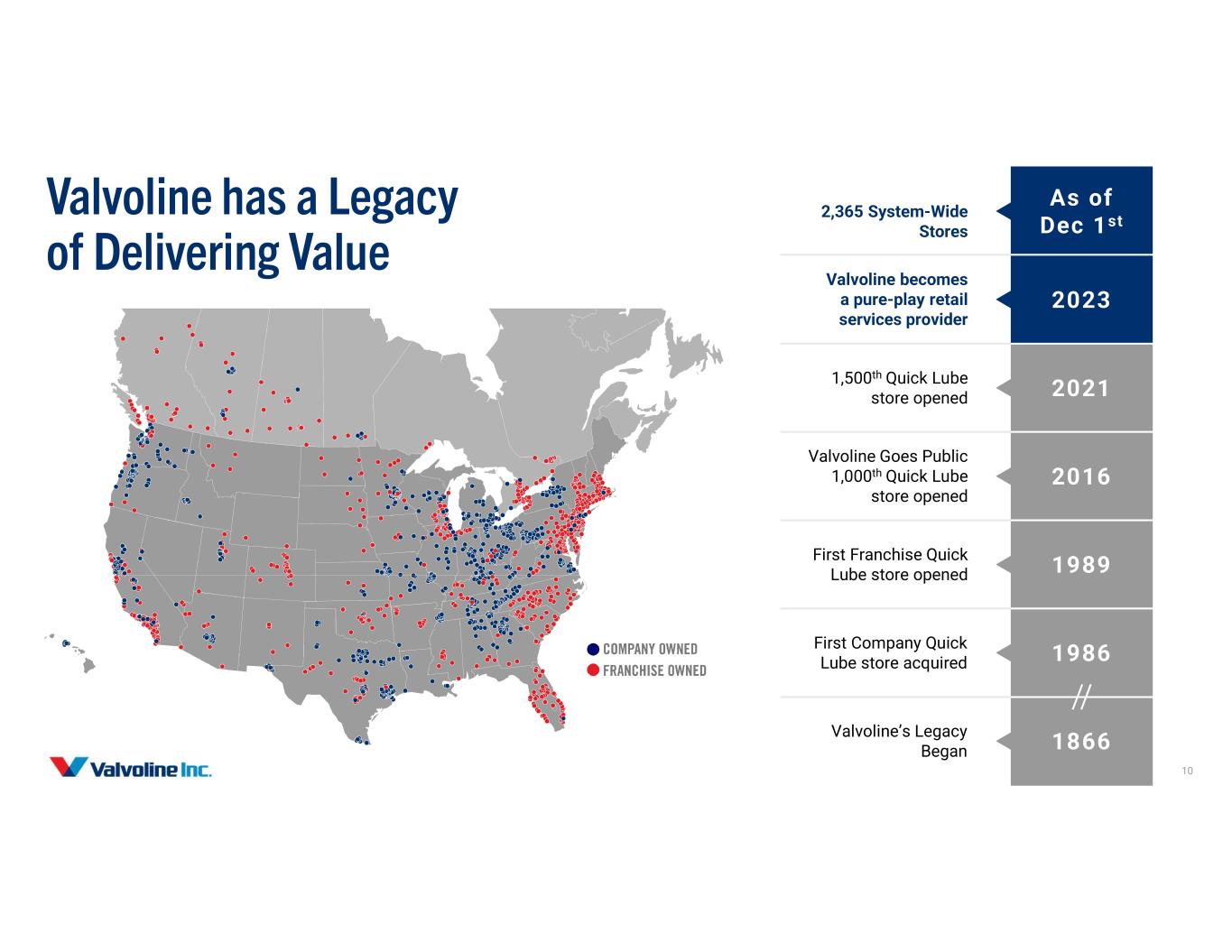Valvoline has a Legacy of Delivering Value Valvoline’s Legacy Began First Company Quick Lube store acquired First Franchise Quick Lube store opened Valvoline Goes Public 1,000th Quick Lube store opened 1866 1986 1989 2016 2021 2023 TODAY 9 Celebrating 10 YEARS since going public