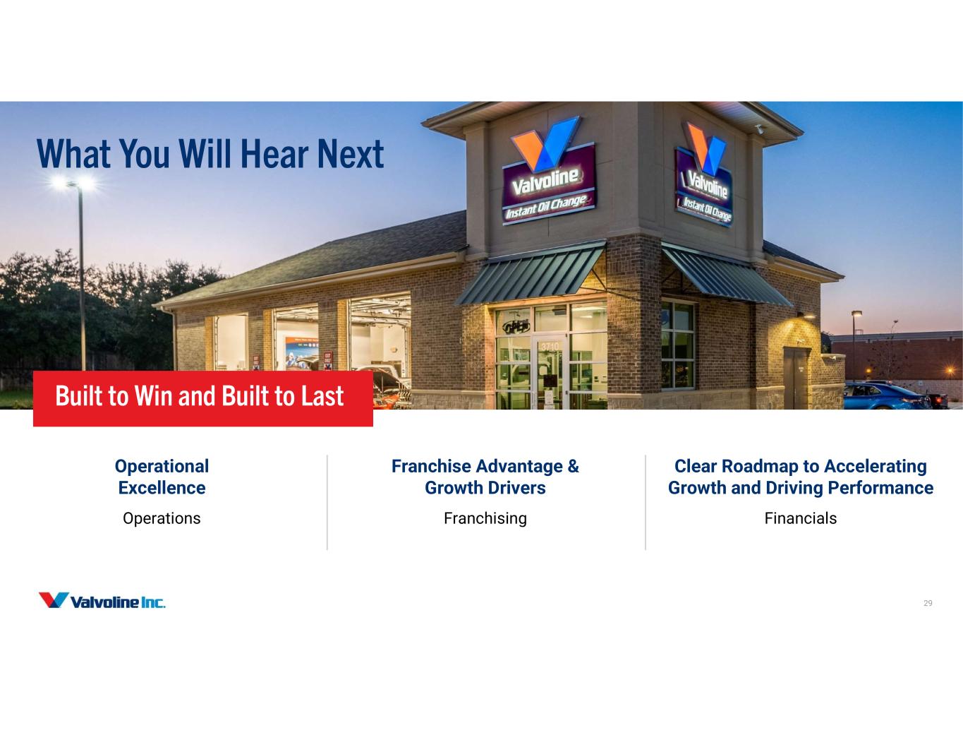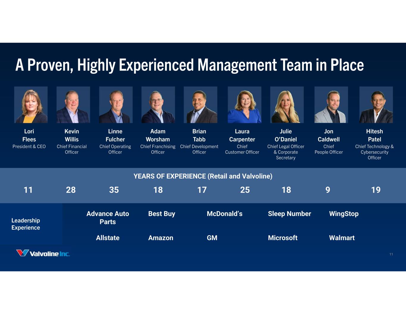A Proven, Highly Experienced Management Team in Place Leadership Experience Lori Flees President & CEO Laura Carpenter Chief Customer Officer Linne Fulcher Chief Operating Officer Brian Tabb Chief Development Officer Adam Worsham Chief Franchising Officer Kevin Willis Chief Financial Officer Julie O’Daniel Chief Legal Officer & Corporate Secretary Jon Caldwell Chief People Officer Hitesh Patel Chief Technology & Cybersecurity Officer YEARS OF EXPERIENCE (Retail and Valvoline) 11 28 35 18 17 25 18 9 19 11 Advance Auto Parts Best Buy McDonald’s Sleep Number WingStop Allstate Amazon GM Microsoft Walmart