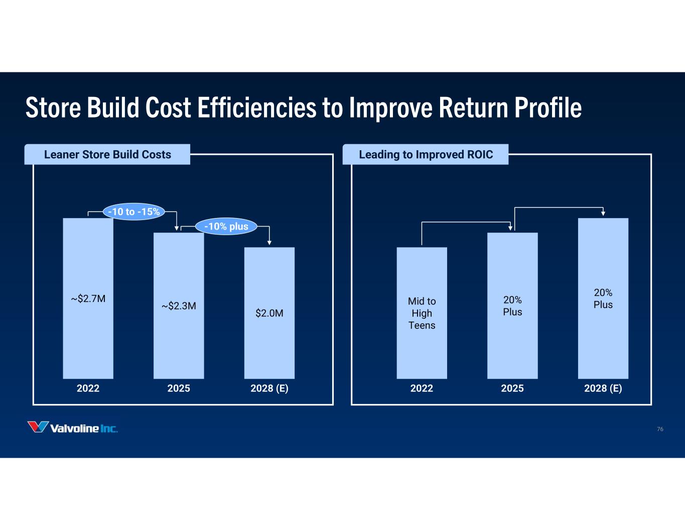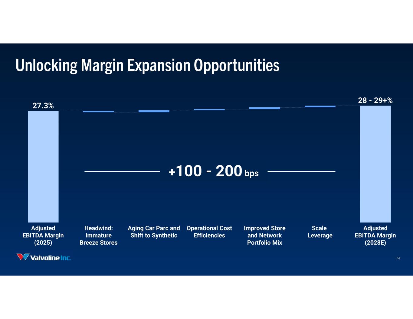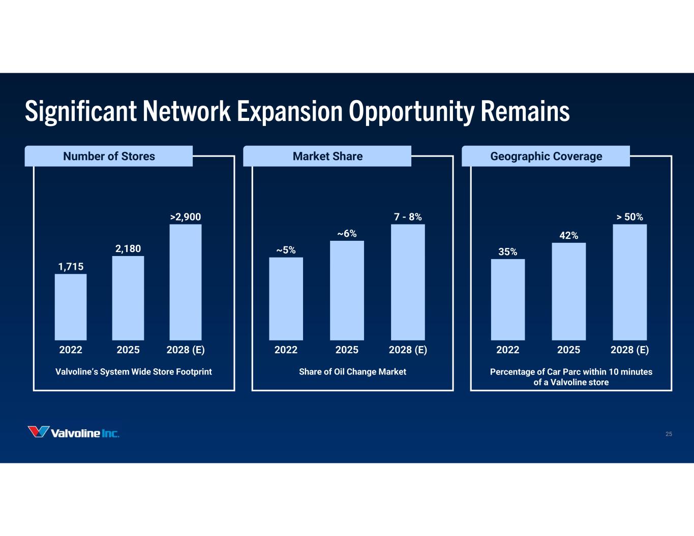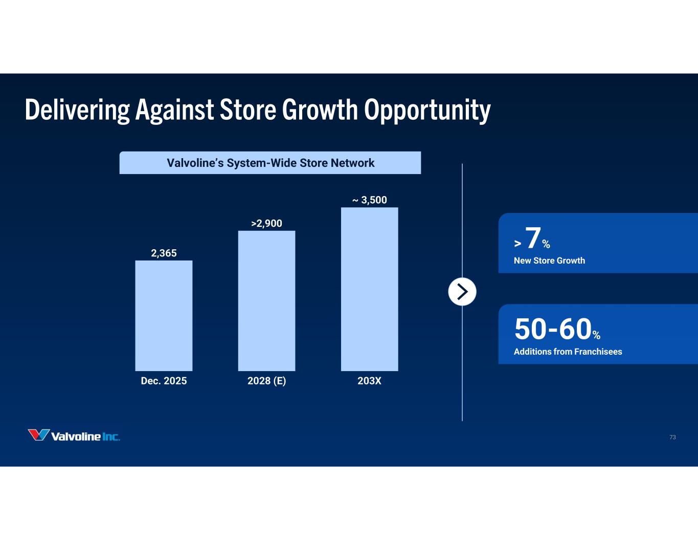 Delivering Against Store Growth Opportunity > 7% New Store Growth 50-60% Additions from Franchisees 73 Valvoline’s System-Wide Store Network 2,365 Dec. 2025 2028 (E) 203X >2,900 ~ 3,500