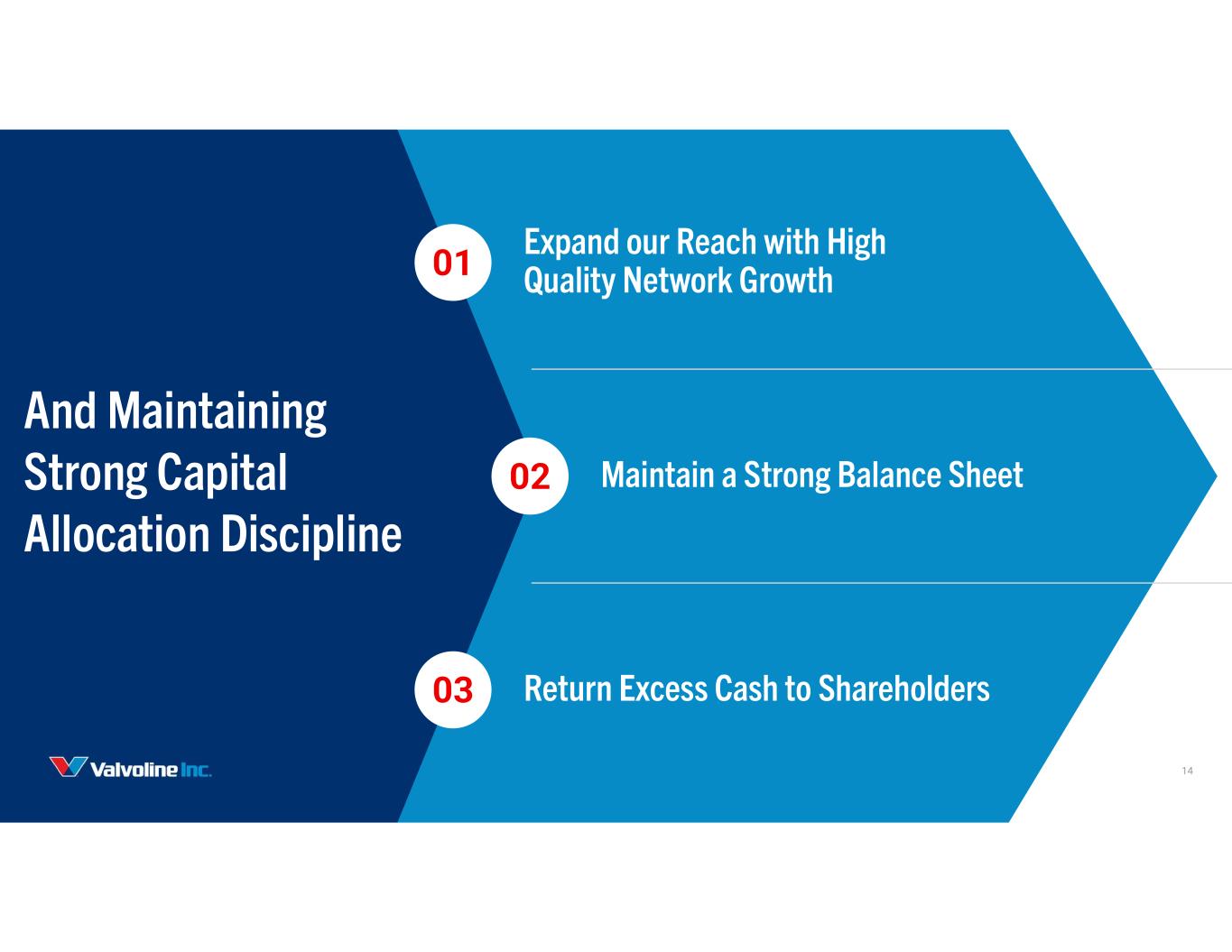 Valvoline’s Growth Ambition New Store Growth System-wide SSS Growth Adjusted EPS Growth Adjusted EBITDA Margin Mid to High Teens +100 – 200 bps expansion > 7% 3 - 5% Committed to Delivering Attractive Returns (2026-2028) 13