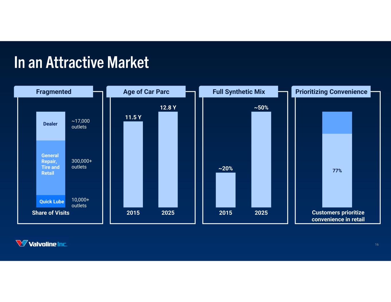 Valvoline has a Legacy of Delivering Value Valvoline’s Legacy Began First Company Quick Lube store acquired First Franchise Quick Lube store opened Valvoline Goes Public 1,000th Quick Lube store opened 1,500th Quick Lube store opened Valvoline becomes a pure-play retail services provider 2,365 System-Wide Stores 1866 1986 1989 2016 2021 2023 As of Dec 1st 10